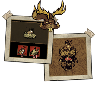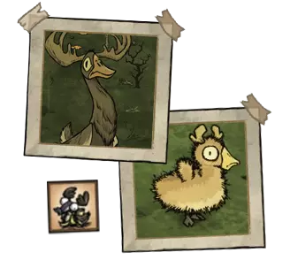 驼鹿/鹅 - 春季巨人。也被称为“卢西”。世界中可能存在多只个体。该 Boss 栖息在池塘附近,并会产下一枚巨大的带电蛋,这枚蛋将在 2 个游戏日后孵化,但玩家可以帮助卢西们,用锤子敲碎蛋。每次攻击后,玩家将受到6.5点电击伤害。鹿/鹅的幼崽数量为5只。有时母兽可能不在巢穴附近,但只要攻击幼崽,小家伙们就会开始呼唤妈妈来帮忙。鹿/鹅会返回巢穴保护幼崽。春末时,鹿/鹅及其幼崽会离开。首领(Boss)会用角进行攻击,但有时它会对你吼叫,导致玩家手中栏位的物品掉落。鹿/鹅死亡后会掉落6块肉、2根骨头和3-5根羽绒。 ●════════════════════════════ஜ۩۞۩ஜ════════════════════════════●