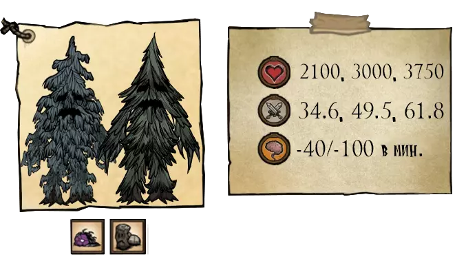 树精是当玩家砍伐过多树木时从松树中出现的 Boss。树精最初对伐木工抱有敌意,认为是伐木工在砍伐它的同伴。它只有一种攻击方式。树精会缓慢追击仇敌,但可以通过在其附近种植松果来使其平静。如果树人攻击其他生物,它会忘记玩家,开始在周围漫无目的地游荡,并在夜间变成松树。从第4天开始,砍伐任何松树都有1.33%的概率使最近的松树上生成树人。伍迪召唤树人的概率比其他角色高50%(即约2%)。第30天后,有50%的概率会同时出现最多两只树人。从第80天开始,若附近有足够的云杉树,将有33%的概率同时出现1到3个树人。树人可以从任何大小的云杉树中生成,前提是云杉树未被烧毁。树人的体型可能各不相同。砍伐扭曲云杉时,也有概率生成一种树人,其行为与普通树人一致,但外观有所不同。中立状态的树人在白天会四处活动,而在傍晚/夜间则会变回云杉树。树精死亡后会掉落6个活木和1个怪物肉。活木是制作许多魔法物品的有用材料!●════════════════════════════ஜ۩۞۩ஜ════════════════════════════● ⠀⠀ ᠌⠀ ᠌尺寸⠀⠀ ᠌⠀ ᠌ ⠀⠀ ᠌⠀ ᠌速度⠀⠀ ᠌⠀ ᠌ ⠀⠀ ᠌⠀ ᠌生命值⠀⠀ ᠌⠀ ᠌ ⠀⠀ ᠌⠀ ᠌伤害⠀⠀ ᠌⠀ ᠌ ⠀⠀ ᠌⠀ ᠌攻击距离⠀⠀ ᠌⠀ ᠌ 小型 0.735 2100 35 2.1 中型 1.5 3000 50 3 大型 2.34375 3750 62 3.75