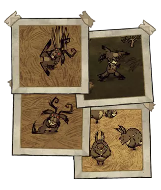 叶状树人是一种从栗色桦树中出现的 Boss,无法移动,只有 1 种体型。其出现概率和数量会随着生存天数的增加而提升,从第 3 天的 3% 增长到第 70 天的 33%。经过足够长的时间(至少一天)后,叶状树人会平静下来并恢复到正常状态。玩家也可以在附近种植桦树坚果,尝试让它们平静下来。叶之树人对所有生物都具有攻击性,这与普通树人不同。无法用武器攻击该 boss,但可以用斧头砍击 18 下将其砍倒,或者将其烧死。它会用树根攻击玩家,并召唤 1-5 个随从(5 点伤害,50 点生命值),这些随从不会离树人太远。砍伐落叶树人后,会掉落1-2块活木、3个栗子,并有20%的几率获得恐惧燃料(挖掘剩余的树桩可额外获得一块活木)。 ●════════════ஜ۩۞۩ஜ════════════● ● 兔王