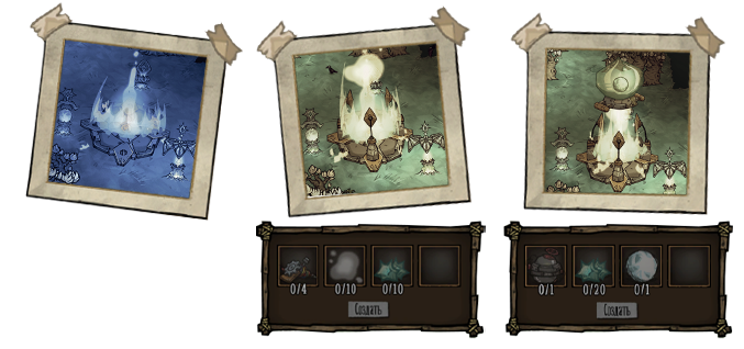 在光明锻造厂可创建用于冰晶生成器的套装。该生成器为可建造建筑,初始状态未激活。冰晶生成器不能放置在水域附近。激活时需放入独眼巨人-鹿的眼球,建筑周围会出现冰冻效果。其拥有范围为9个草皮格子的极强冰冻光环。灵气如此强大,即便身处区域边缘,在炎热的夏季也很容易感到寒冷。灵气区域内呈现冬季环境:食物腐烂速度减缓25%,且不会自燃。结晶器及其周围一小片区域在地图上可视,如同“天眼”一般。可以随时取出独眼鹿之眼。 ●════════════ஜ۩۞۩ஜ════════════●