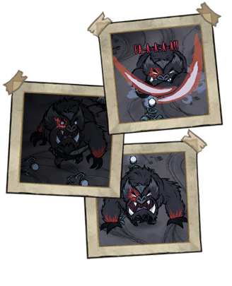 瓦尔格——迅捷生物的掌控者。循着踪迹,能发现不寻常的爪印与齿痕。若继续搜寻,会发现瓦尔格已抢先一步找到煤烟巨兽,将其吞噬殆尽,只留下骸骨。瓦尔格能够召唤迅捷生物,其种类取决于季节。不会消失。出现概率从第1天的2.5%变化到第100天的16.5%。被其杀死后会留下1-3个猎犬的獠牙和4-6份怪物肉。 ●════════════════════════════ஜ۩۞۩ஜ════════════════════════════●
