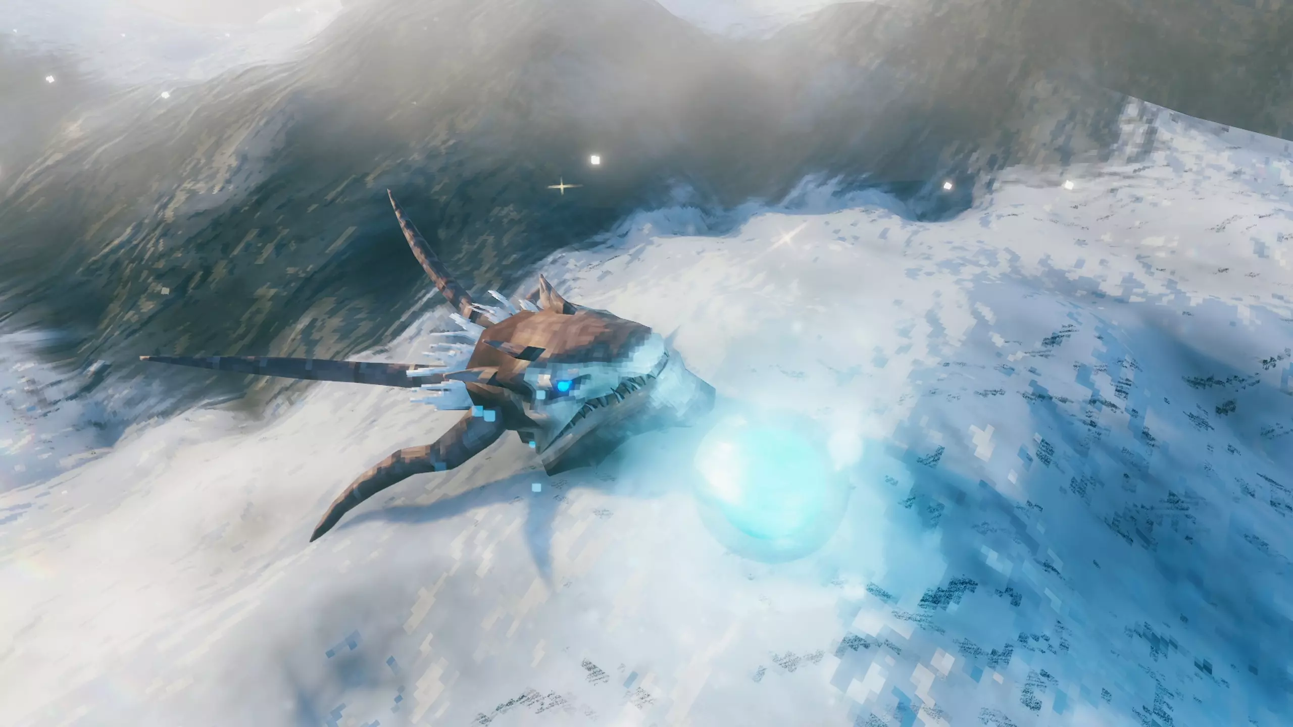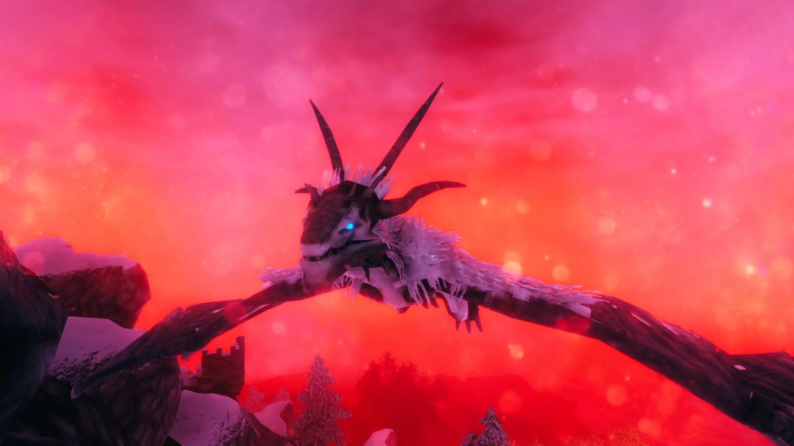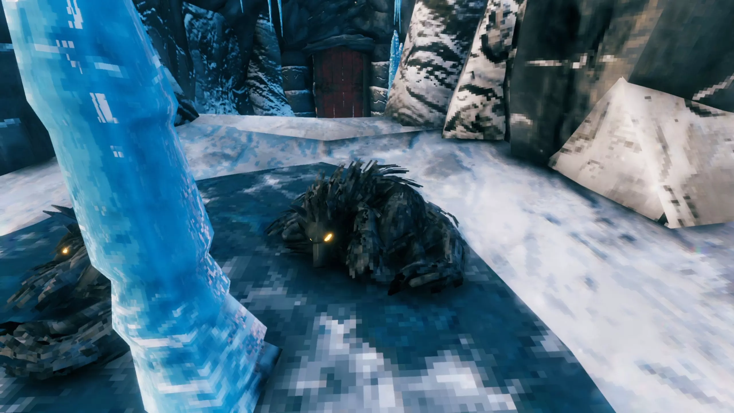 这是一只体型庞大的龙类生物,拥有四种攻击方式。在空中时,它会从嘴中吐出冰晶来攻击你。当它落地后,则会喷射造成高额伤害的冰霜吐息。此外,它还会尝试用嘴咬你或用爪子进行攻击。而且这种攻击常常会把玩家直接打下山,所以在近距离攻击它时需要注意这一点。 当它飞行时,可以用弓箭射击。我个人建议制作“尸鬼之爪(Клык Драугра)”并使用火箭,因为这把弓本身就带有中毒效果,再加上火箭还能点燃它。等它落地后,就可以拿出主武器攻击它的尾部了。