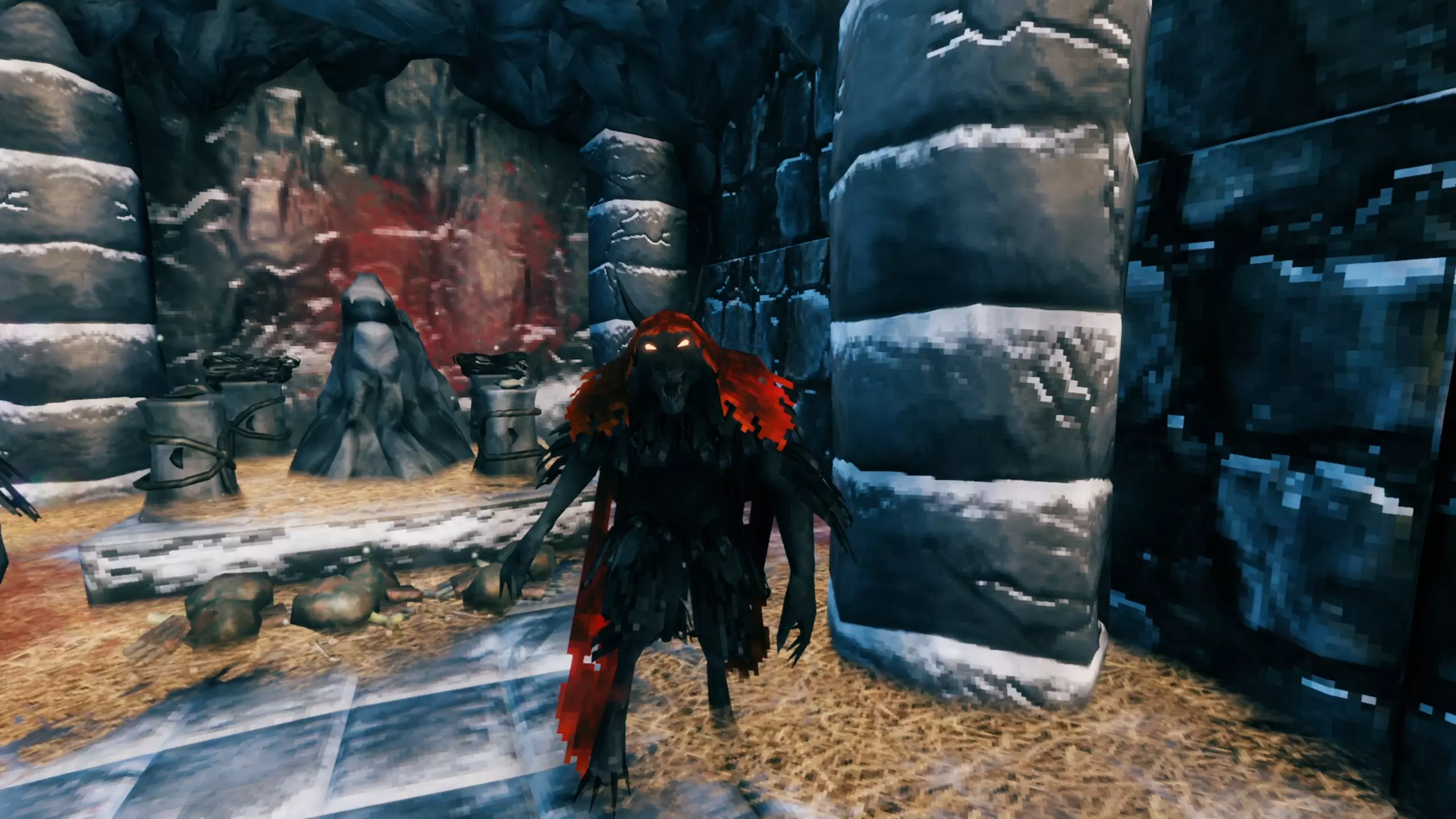 可怕的洞穴。本质上和冰洞一样,但除此之外,这里还栖息着盖拉法——这是希尔迪尔更新中新增的迷你 Boss。它看起来像白化的邪教徒,并且与他们不同的是,它研习了寒冰魔法。击败它后,会掉落头颅和希尔迪尔的银宝箱。如果将其交给商人,她的商品种类会增加新物品,营地也会略有改造。