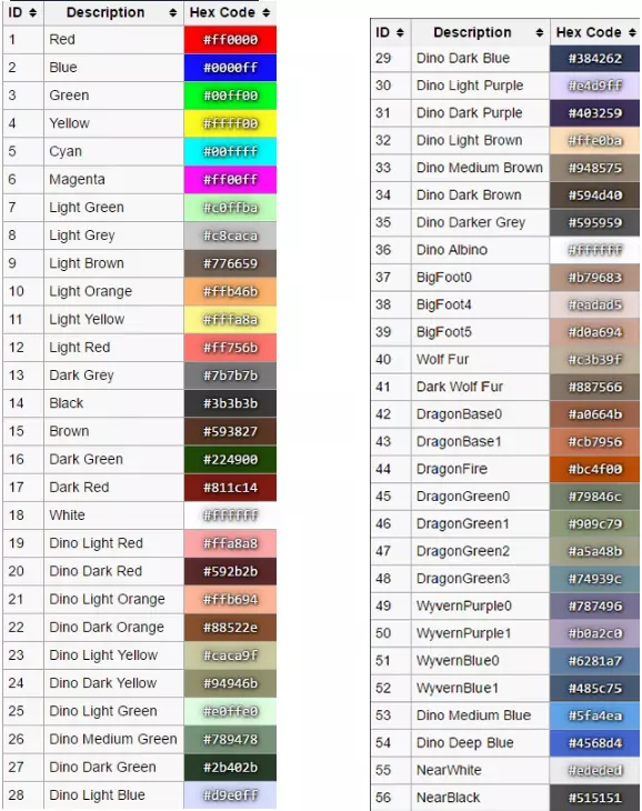 笔记网站链接 - http://ru.ark-survival-evolved.wikia.com/wiki/%D0%97%D0%B0%D0%BC%D0%B5%D1%82%D0%BA%D0%B8_%D0%BF%D0%B5%D1%80%D0%B2%D0%BE%D0%BF%D1%80%D0%BE%D1%85%D0%BE%D0%B4%D1%86%D0%B5%D0%B2/%D0%9C%D0%B5%D1%81%D1%82%D0%BE%D0%BF%D0%BE%D0%BB%D0%BE%D0%B6%D0%B5%D0%BD%D0%B8%D1%8F 来源 http://www.ark-world.ru/ark-survival-evolved-id-predmetov/- 物品ID http://shillianth.com/games/ark-survival-evolved/ark-survival-evolved-admin-cheat-sheet-with-dino-names-saddle-kibble-ids-in-1-easy-place/ - 恐龙ID https://www.youtube.com/channel/UCdYJOZTLVkpQYm8G_0ul6Cg http://ark.gamepedia.com/Entity_IDs - 物品ID http://ark-game.ru http://ark-play.ru https://www.google.恐龙颜色ID 更改生物的自然颜色(例如作弊指令SetTargetDinoColor 0 6,恐龙将变为粉色,ColorRegion请选择0到5之间的值) 管理员作弊指令SetTargetDinoColor <ColorRegion> ColorID