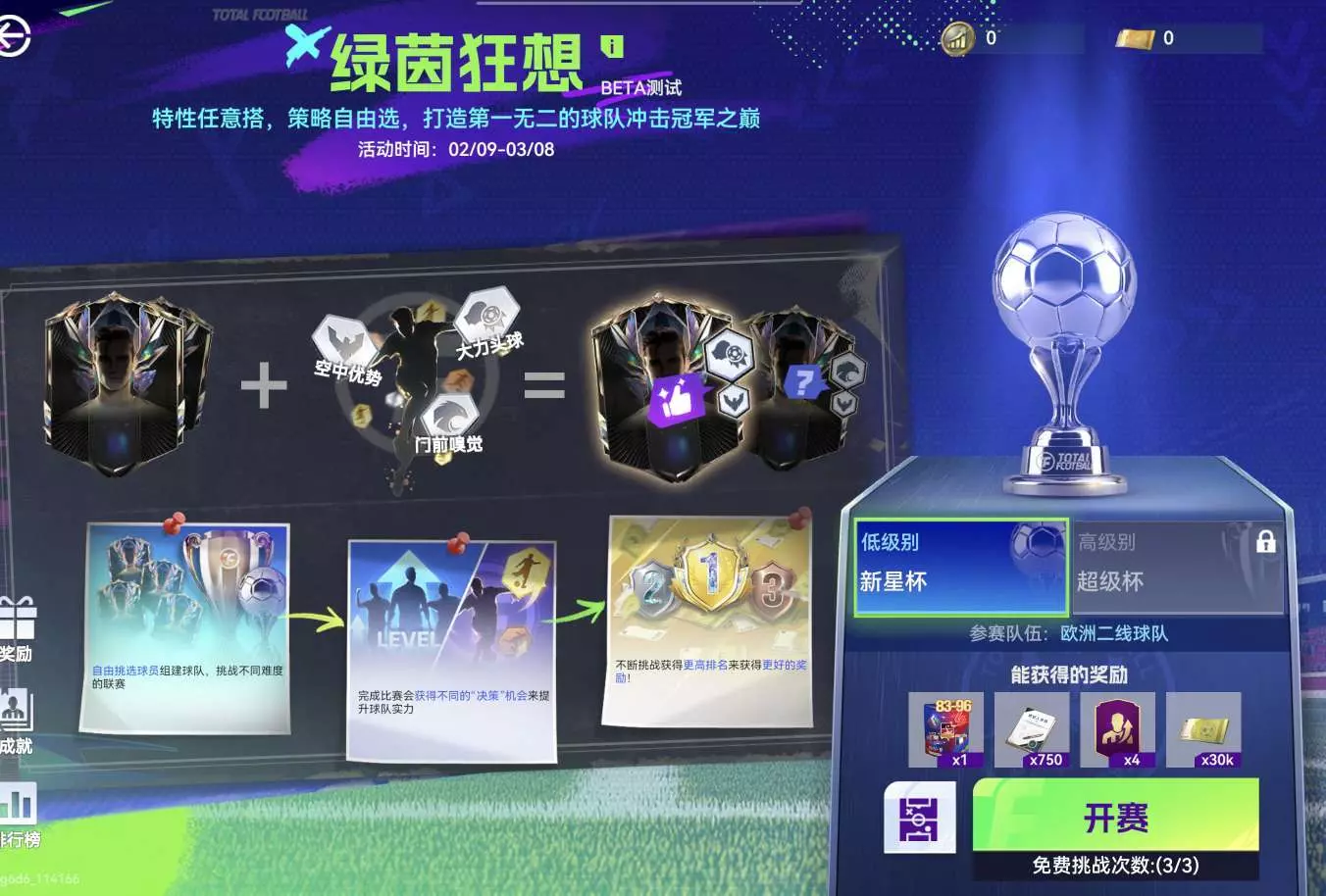即人机联赛,还原度满分5分可以给到3.5分。共六大主流联赛可选,首通奖励丰富,至少对于前期发育来说是足够的,一个赛季(游戏中)可领取2名强力3星88分40级租借球员(限时7天),暂时补强阵容。