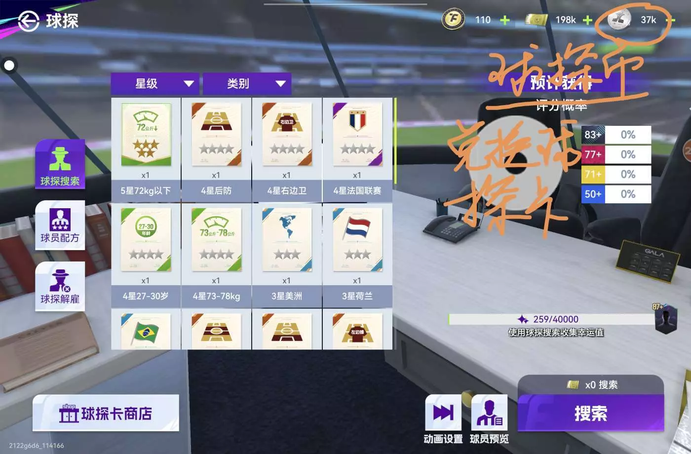 球探:1~8星球探卡,星级越高,爆率越高,每次限用3张,消耗欧元。