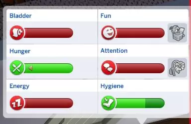 模拟市民的需求 膀胱需求可通过马桶解决,卫生需求可通过浴缸、淋浴或水槽满足。饥饿可通过点击烤箱、冰箱或微波炉并选择要烹饪的餐点来补充。你也可以从冰箱或冷藏箱中选择速食餐。能量可通过在床上睡觉或在长椅、沙发上打盹来恢复,也可以通过咖啡暂时提升。娱乐和社交需求则更具灵活性,也没那么明显。面对面互动能最快填满社交条,但也有其他方式。模拟市民还可以在线聊天或使用手机聊天,也可以看电视、听音乐、跳舞等。