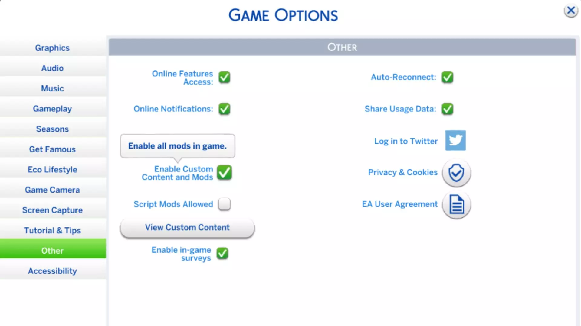 之后你需要在《模拟人生4》游戏中启用自定义内容和模组,然后重启游戏以应用所有更改。