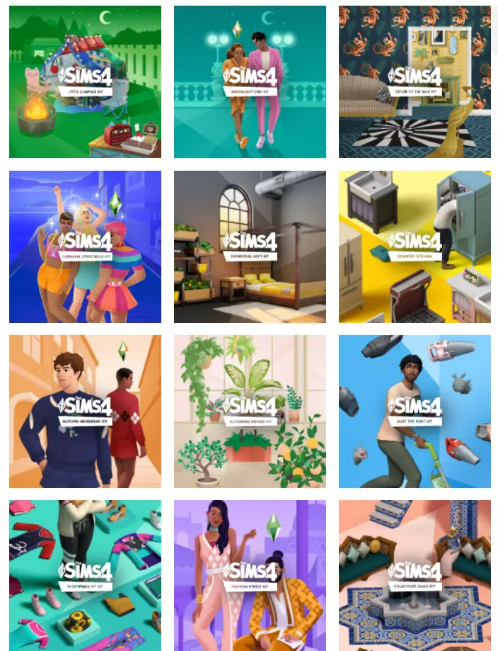 套件 《模拟人生4:乡村厨房套件》——添加一系列复古厨房家具 《模拟人生4:除尘大作战套件》——添加吸尘器和吸尘游戏玩法 《模拟人生4:复古健身套件》——添加一系列90年代风格时装 《模拟人生4:庭院绿洲套件》——添加一系列受摩洛哥传统庭院建筑启发的物品 《模拟人生4:工业风阁楼套件》——添加一系列受纽约布鲁克林改造仓库启发的物品 《模拟人生4:时尚街头套件》——添加一系列受孟买时尚场景启发的服装 《模拟人生4:仁川 arrivals 套件》——添加一系列基于首尔标志性机场时尚的服装 《模拟人生4:繁花房间套件》——添加多种室内植物 《模拟人生4:现代男装套件》——添加一系列成年男性服装物品《模拟人生4》:街头狂欢服饰组合——添加了一系列受巴西狂欢节启发的服装和配饰