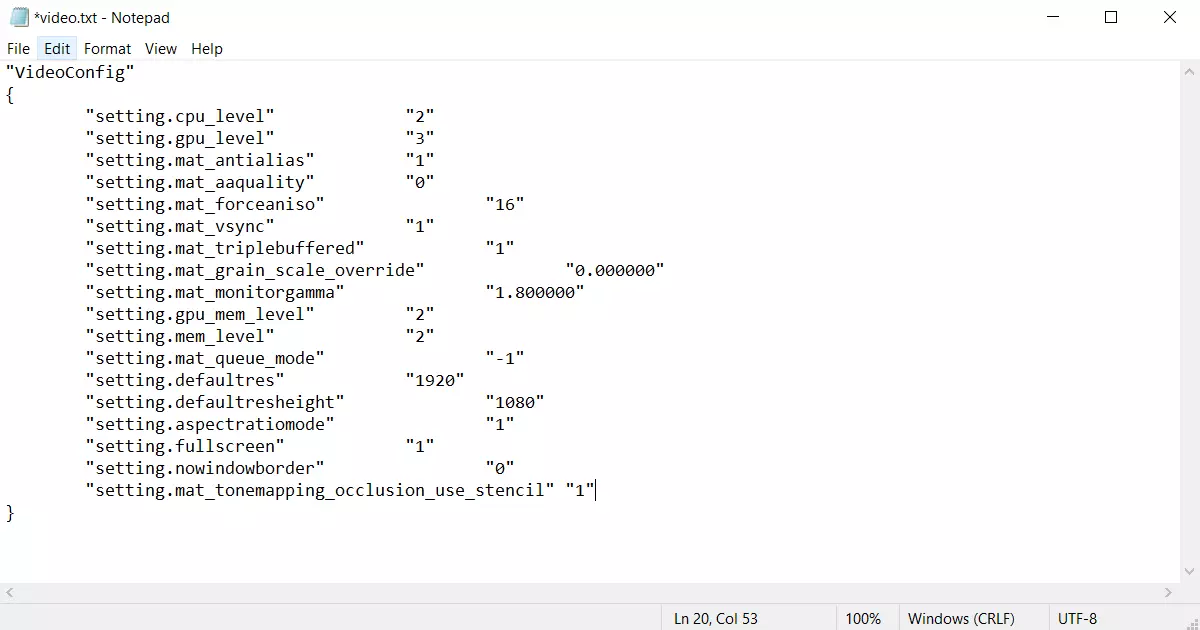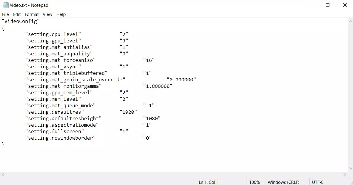 打开dat cfg文件夹并执行此操作。在文件夹底部找到名为“video.txt”的文件,用记事本(或任何同类应用程序)打开它。(补充说明 - 似乎你可以同时对videodefaults.txt和video.txt进行此操作,这样就完全不需要执行最后一步了!)