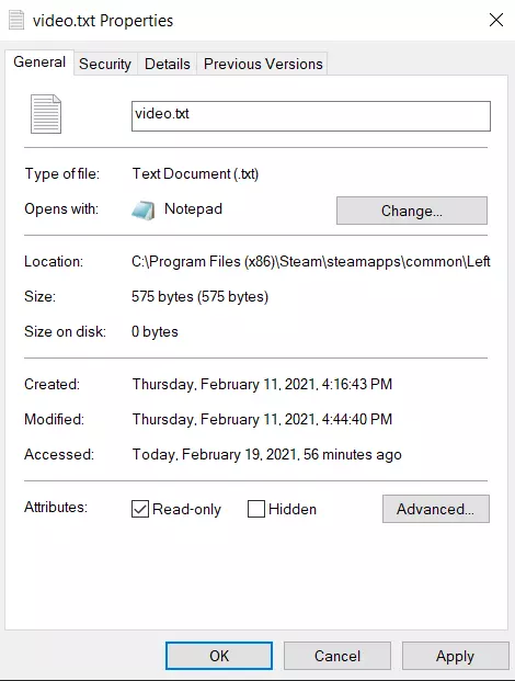 点击video.txt文件(不要打开它),然后右键点击,打开属性。勾选“只读”选项,点击应用并关闭。 这样设置后,你的设置将不会在未经你更改的情况下被修改。对于大多数人来说,如果你不设置只读,你刚刚添加到文件中的设置会被移除,地图也会一直保持昏暗。 以上就是全部内容了! 完成所有操作后,你就可以尽情享受游戏了! 咱们就当我没花4年时间才最终编辑完这个指南 XD 非常抱歉拖了这么久才完成编辑,我太拖延了。 总之,享受游戏,打爆那些僵尸的头吧!