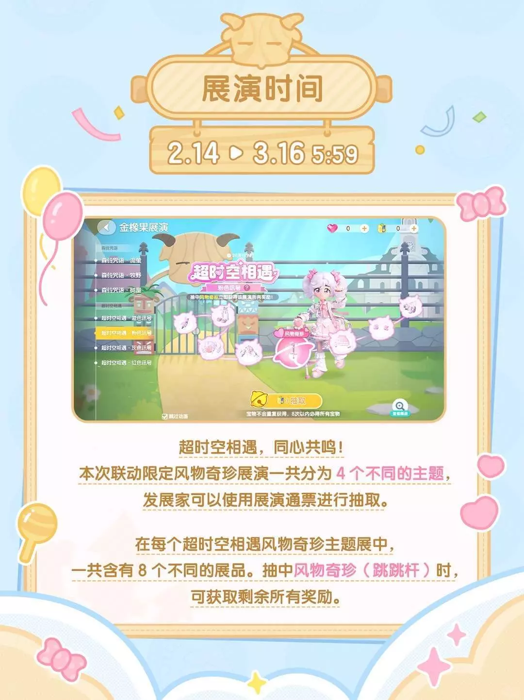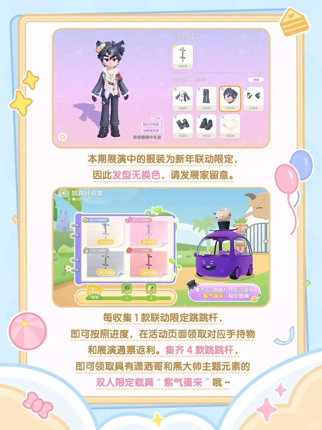 金橡果商会准备了风物奇珍主题展等待发展家选购。发展家收集指定数量的限定载具,将可以获得联动限定手持物:平底锅玩具、展演通票和联动限定双人载具“紫气蛋来”。