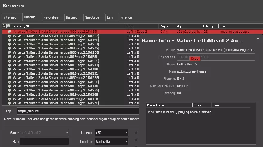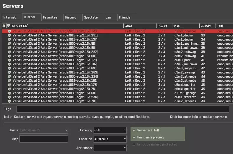 使用服务器浏览器 *推荐* 本指南中我个人使用并向大多数人推荐的最佳方法。有两种访问服务器浏览器的方式。最常见的是在游戏内使用控制台命令,或者使用包含服务器浏览器的用户界面模组,以便在主菜单中日常便捷使用。 openserverbrowser 第二种方式是通过Steam客户端左上角菜单。在“查看”选项卡下,你会看到“游戏服务器”选项。也可以通过游戏内的Steam覆盖层访问。这种方式范围更广,支持多种游戏,不仅仅是《求生之路2》。它的功能与服务器浏览器相同,但我发现使用起来相当不顺畅,所以“旧的仍是好的”。不要使用这种方式,坚持通过控制台使用服务器浏览器,这样更好。查找正在运行的游戏 使用服务器浏览器的一种方法是查找正在运行的游戏。这种方法通常更好,因为你可以浏览更多服务器,甚至不受区域锁定限制,还能提前查看服务器内的玩家。 进入服务器浏览器后,前往“自定义”标签页。在下方的“更改筛选器”选项中,你可以选择偏好的地区,即“位置”选项。由于某种原因,该游戏中的东南亚服务器表现很差。如果你选择“亚洲”,会显示所有模组服务器;若想显示正常的亚洲Valve官方服务器,你需要选择“澳大利亚”。情况就是这样,如果你不确定自己的地区,可以尝试所有选项。然后在“延迟”选项中选择最低延迟,比如选择50,这样延迟高于50的服务器将不会显示。如果确实没有任何结果显示,之后可以将其增加到100,但通常50就足够了。我们想要的是距离我们最近的最佳服务器。勾选“有玩家正在游戏”和“服务器未满”这两个选项来查找正在运行的游戏,这非常明显。如果你想要特定的游戏模式,比如写实、生存、对抗等,也可以指定标签。找到服务器后,直接连接即可。 要区分官方服务器和模组服务器,可以查看它们的名称。你要找的服务器名称类似“Valve Left4Dead 2 Asia Server”,后面带有srcds编号,这也非常明显。