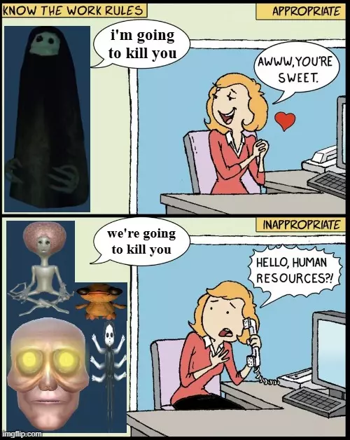 THESE are the Semibots of the future, at least to the Taxman. Oh, wait, wrong game... The Story as a Whole (This section is a large conclusive wrap, which is also probably the sequel story to R.E.P.O., enjoy! There is a surplus of speculation here.) So, the game starts out with the earliest known event: the discovery of Magic. Who discovered Magic is unknown, possibly Headman (but I don't have any proof for this), but whoever it was doesn't really matter as Magic was hard to master and required extreme mental skill. Not many people used it, allowing technological progress to continue as normal uninfluenced by the discovery of Magic, but a school was started in Denmark for those naturally gifted at the art of Magic: Swiftbroom Academy. Headman, a young man at the time, was exceptionally gifted at Magic: he quickly learned how to use a staff, how to cast spells, and became the generally best mage at Swiftbroom as a teacher. Eventually, he became the Headmaster of Swiftbroom Academy, teaching the newer students the art of Magic and how to harness it as he had. Eventually, he started a family with somebody else, possibly a witch he met at Swiftbroom, and grew enough in wealth to afford a manor deep into the pine forest with his family name labeled upon it: Headman Manor. Meanwhile in Denmark, McJannek Station was secretly founded by the government of Denmark and a construction company in Greenland to research the strangely anomalous fossils found around a particularly cold and lifeless region. While the government was finalizing the creation of McJannek, the mechanical division of the government finalized a prototypical AI, nowadays known as the Taxman. It's creation was heavily controversial within the government due to moral concerns and the general lack of ethical concerns from the AI, and the Taxman's existence was kept hidden from the public. It was also considered generally useless as a glitch caused the Taxman to speak mostly if not entirely through emojis. Around this time, McJannek Station was finalized in construction, and a research team was sent to the building to extract the fossils and strange items contained within the ice found deep under the snow. However, instead of simple dinosaur fossils, the research team at McJannek uncovered something significantly worse. On the first week of April, 2097, one of the researchers brought a icicle containing a small corpse, of some unidentifiable mutant creature, into the facility for further research. Breaking it open, they studied the odd humanoid corpse; it pulsated slightly, it's gray and frail skin shifting and changing, it's chest heaving as if it were alive. Further study indicated the corpse was, in fact, dead. Their study of the corpse continued for days, before one of the researchers felt something in their chest. They couldn't breathe. A few hours later, the researcher fell over, dead. The rest of the researcher team felt sick as well, and quickly died. Government officials investigated the scene, but felt sick as well shortly afterward. Eventually, the disease escaped McJannek Station, and spread through Denmark like wildfire. Panic spread throughout the populace of Denmark as most people were beginning to get infected. Headman slowly grew more restless as he grew more worried for his family, for the new mages of Swiftbroom, for the art of Magic to be lost. Eventually, he became mad with worry. He broke. Headman went to Swiftbroom Academy with a purpose. Headman began to massacre the Academy with his strong Magic, in a mislead mindset of that he was saving them from the disease. Most mages there died, with those that survived barely living and their blood written upon the wall in a dying breath. Headman, now recovering from his mental break, realized that the disease would soon come for him. He couldn't kill himself, no, that would be cowardly. Instead, he turned his staff upon himself and turned himself into an immortal head, forever a ghostly apparition that would never truly die. A mistake he would grow to regret. The government of Denmark grew worried too, at this point. The disease was unable to be studied by doctors, and the few experienced mages that could've casted spells of protection had been killed. They had a sudden idea: the Taxman. It could calculate infinite possibilities, infinite ways for the disease to be cured and to save humanity. If they put the trust of continuing humanity into Taxman's hands, he could possibly reincarnate humans decades later in mechanical bodies so they could rebuild once more. A genius idea, at the time. They made a program where those who were qualified as productive citizens could sign up to have their consciousnesses digitally transferred into databanks for the later use of Taxman. While Taxman was sadistic and unethical, and could barely communicate, there wasn't the time nor the budget to create a more ethical sentient AI for this task. The day the program was open to public eyes, thousands if not millions of civilians from Denmark and surrounding countries immediately flocked to have their consciousnesses transferred, so they could live through the inevitable disease. Eventually, they did, and as most of humanity died, Taxman was reactivated once more and given access to the near-infinite database of human minds and given a task to reincarnate them. Taxman eventually did. In other news, some people who appeared dead were still alive, somehow. They were struggling to stay alive, but they were technically, somehow, alive. Those few amongst the sea of bodies lining the streets of Denmark were those who were immune. After a few days, and after the extinction of 95% of humanity, the immune rose from the floors mutated but still mostly human. As the weeks ticked on, they changed more and more, each human growing into their own mutant form, exposed to the side effects of the virus they weren't supposed to be even alive to experience. These humans eventually lost the ability to speak as 