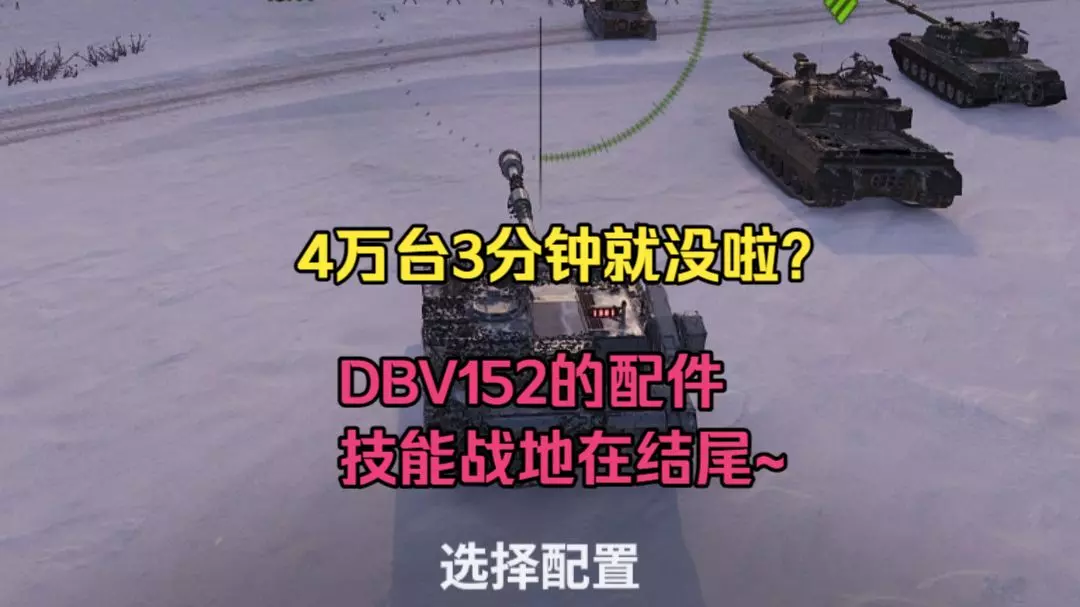 这是《坦克世界》的游戏内容,展示了玩家倾尽家产兑换的DBV152坦克在雪地等地图的随机战表现,玩家体验后发出“抢得后悔吗”的疑问,还提到该坦克开起来动力充足。