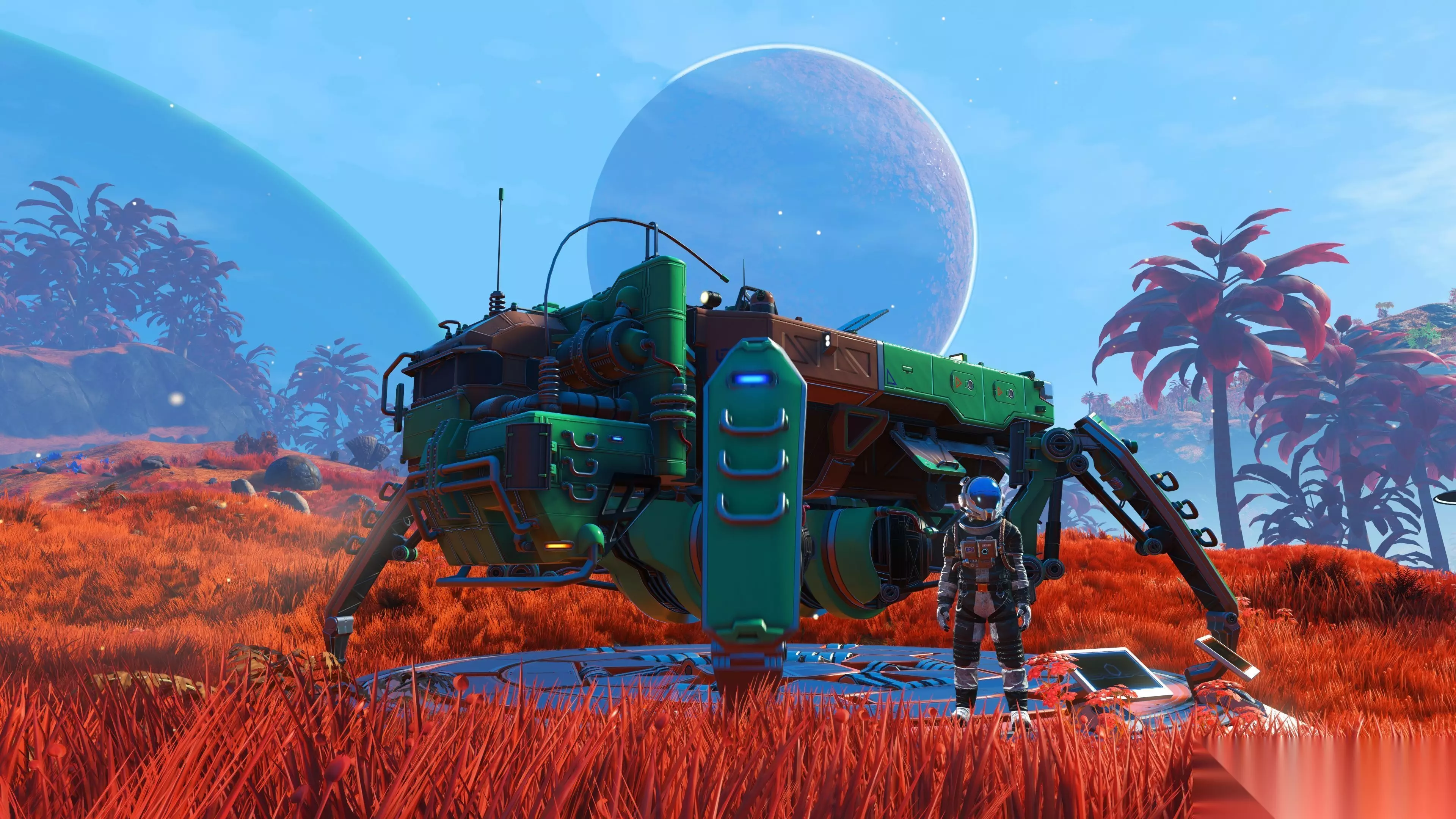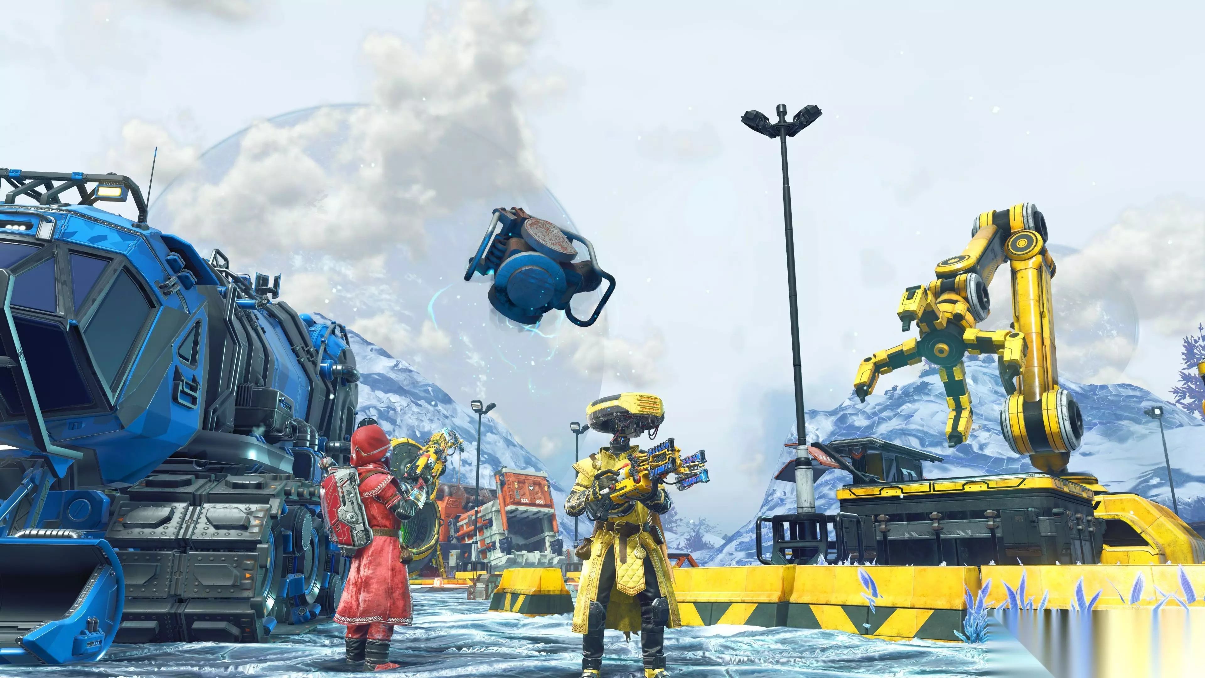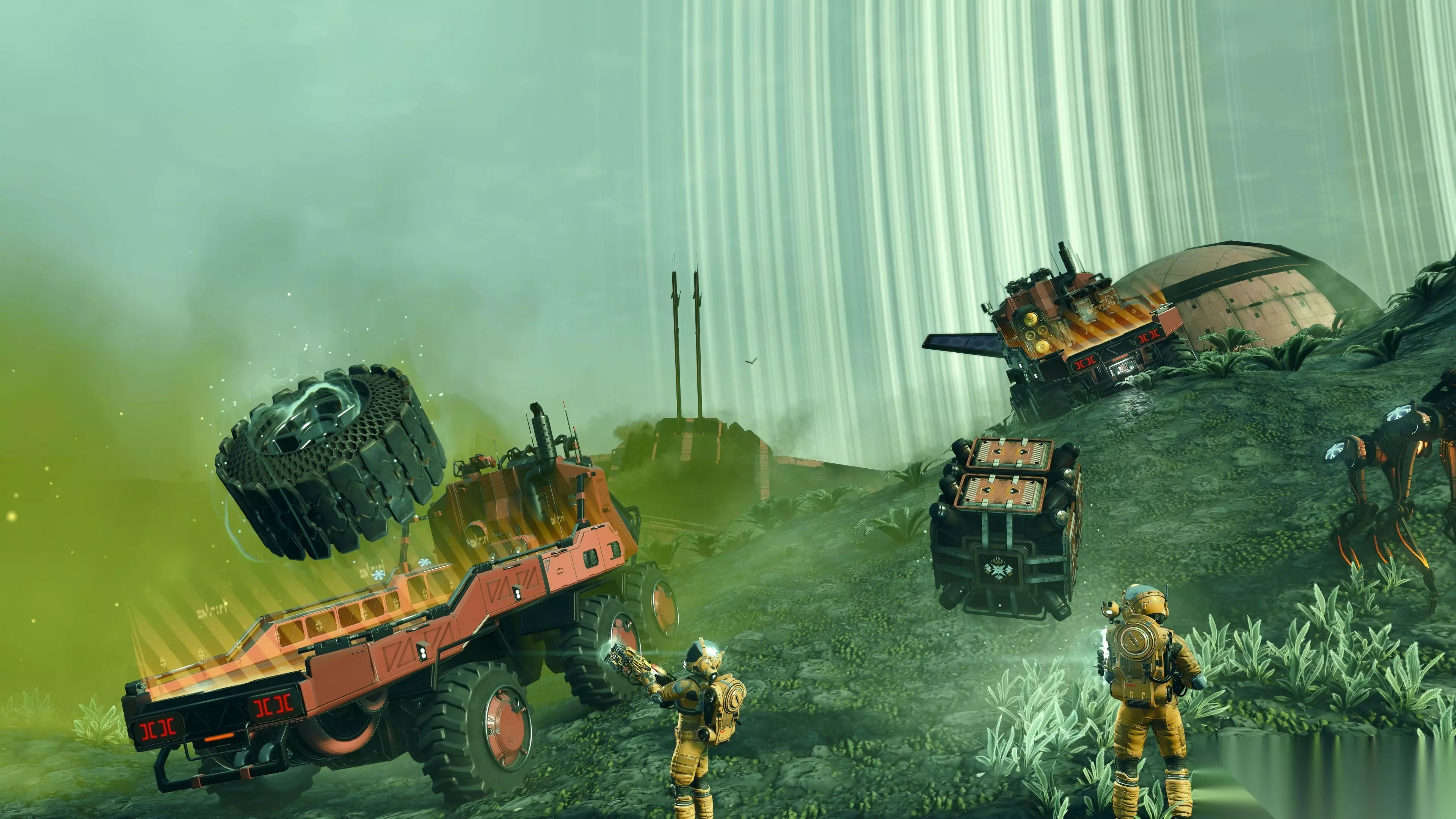 现在,行星上随处可见的残骸和碎片可以被收集,并回收成稀有且珍贵的资源。 可以建造全新的卡车、翻斗平板车和运输车,将资源运回工业回收场进行回收。你可以独自工作,也可以和朋友组成回收小队。这创造了一个非常有趣且具有触感的全新玩法循环:搜寻残骸、将货车装满货物,并在异星景观中穿梭运往工业场,以获取新的战利品和奖励。
