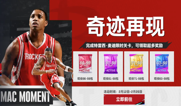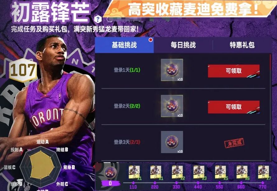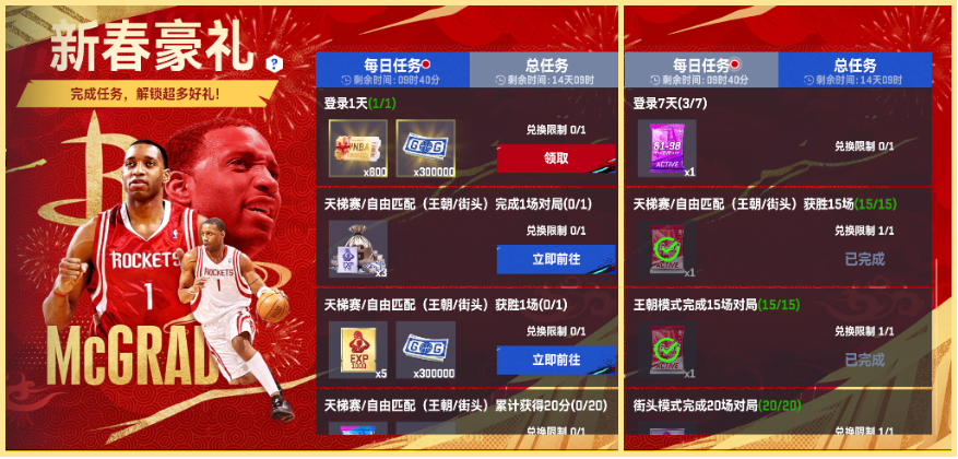 1、活动期间完成基础任务和每日任务,累计进度值解锁新秀猛龙麦迪球员卡奖励。