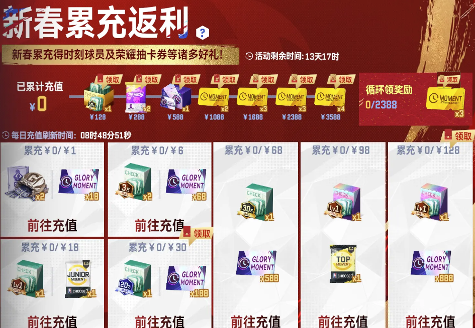 新春累充得时刻球员与荣耀抽卡券好礼!更有个人红包,使用即可向全服玩家送祝福发放红包奖励!
