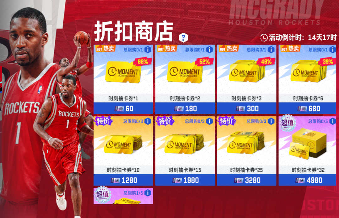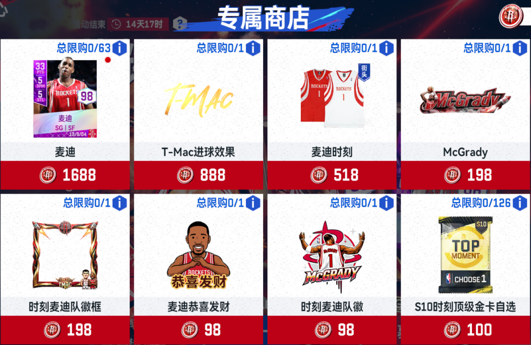 2、在【特惠商店】可以购买球员卡礼包,集齐满突球员,更有王朝火箭球衣可购买
