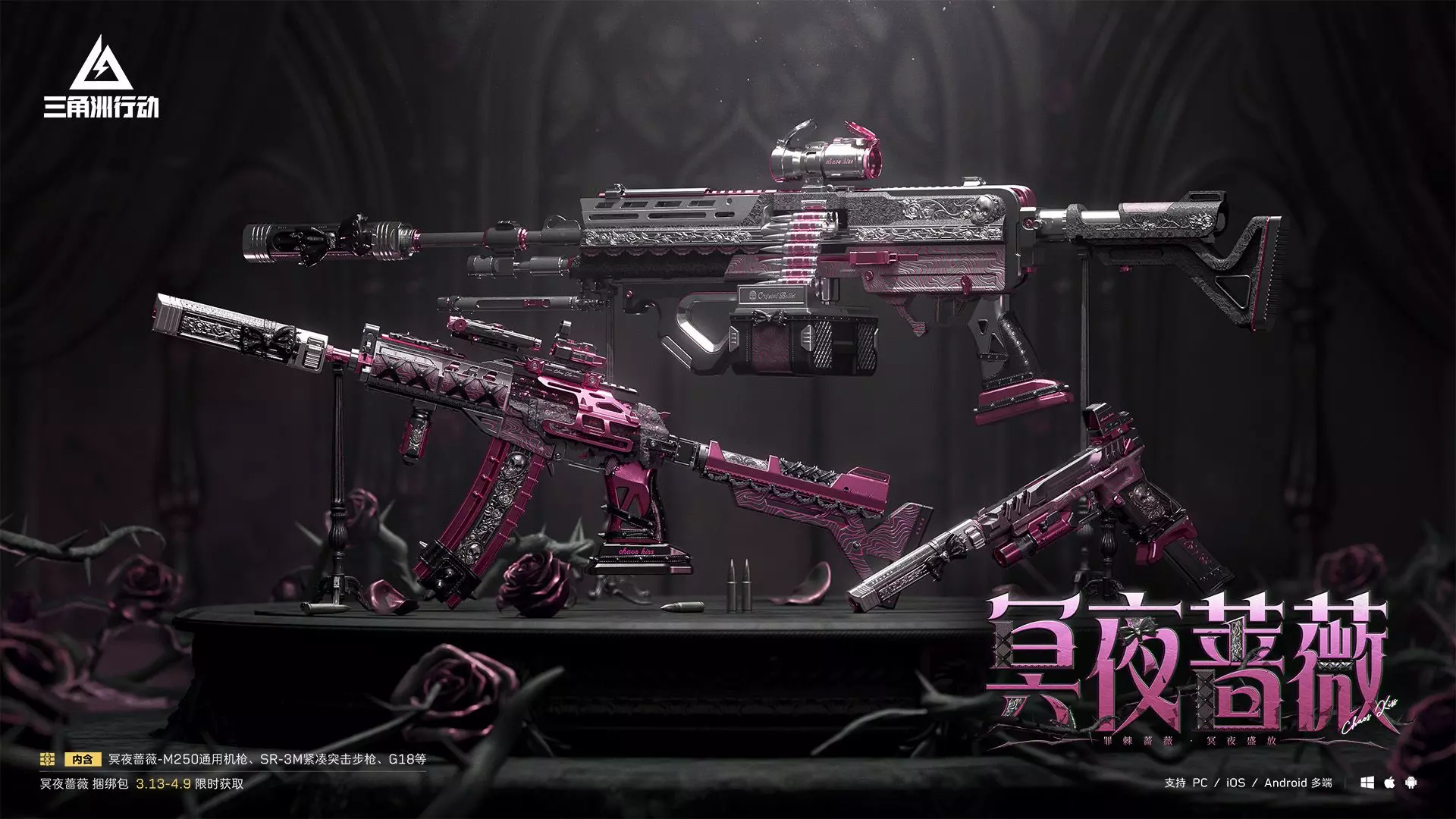【冥夜蔷薇】系列外观亮相!3月13日至4月9日限时上架! 【冥夜蔷薇】系列外观以黑与玫红为主调,蔷薇纹饰与冷冽金属交织,优雅与危险并存。 该系列外观包含:【M2…