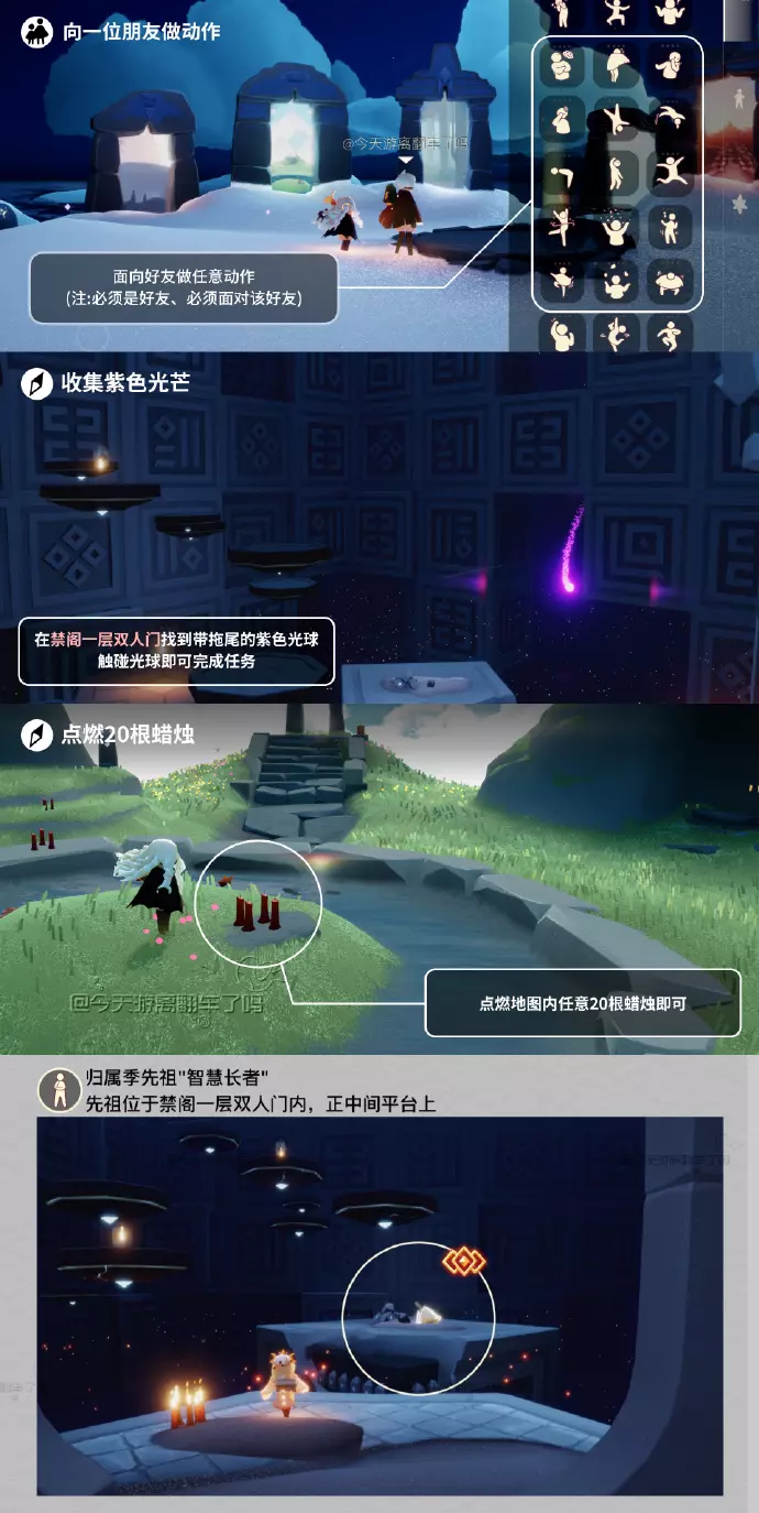 《光遇》游戏中每天的每日任务及大蜡烛的位置都不相同,玩家完成每日任务及收集大蜡烛都可以得到丰厚的兑换奖励,奖励可以用于兑换各种动作及道具,不过很多小伙伴不知道每日任务怎么做,又懒得自己去找大蜡烛的位置,我们汇总了每日任务的完成攻略以及蜡烛位置,一起来看看吧!