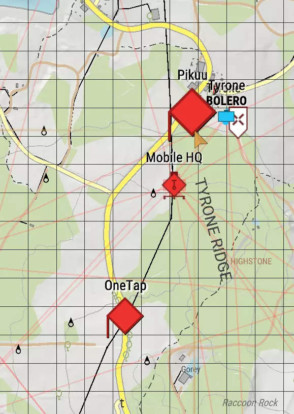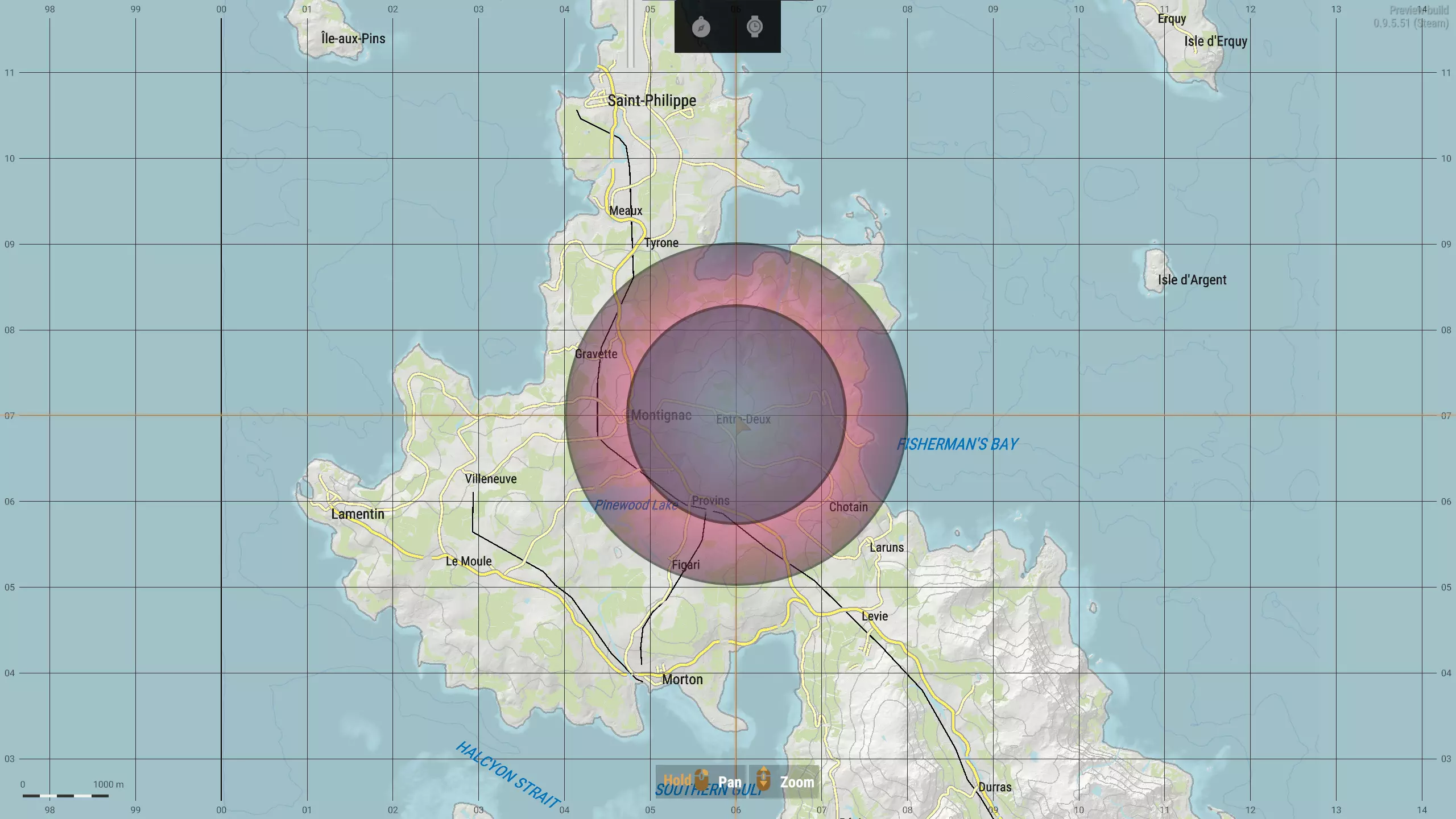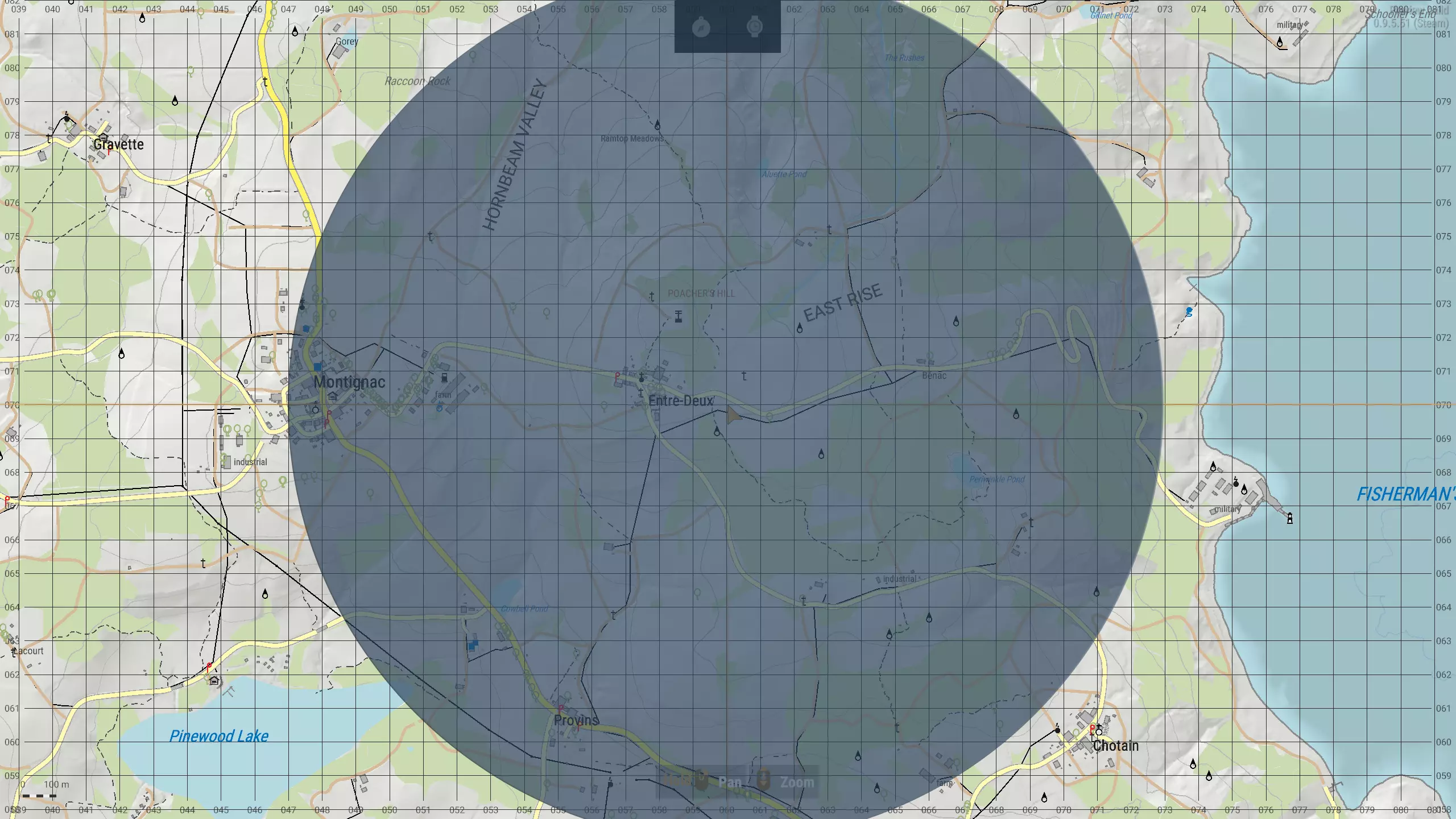 上图所示为所有阵营使用的便携式手持电台的1.3公里范围。注意我稍微放大后,网格方块数量明显增多。左下角的条形比例尺现在显示为100米(0.1公里)。