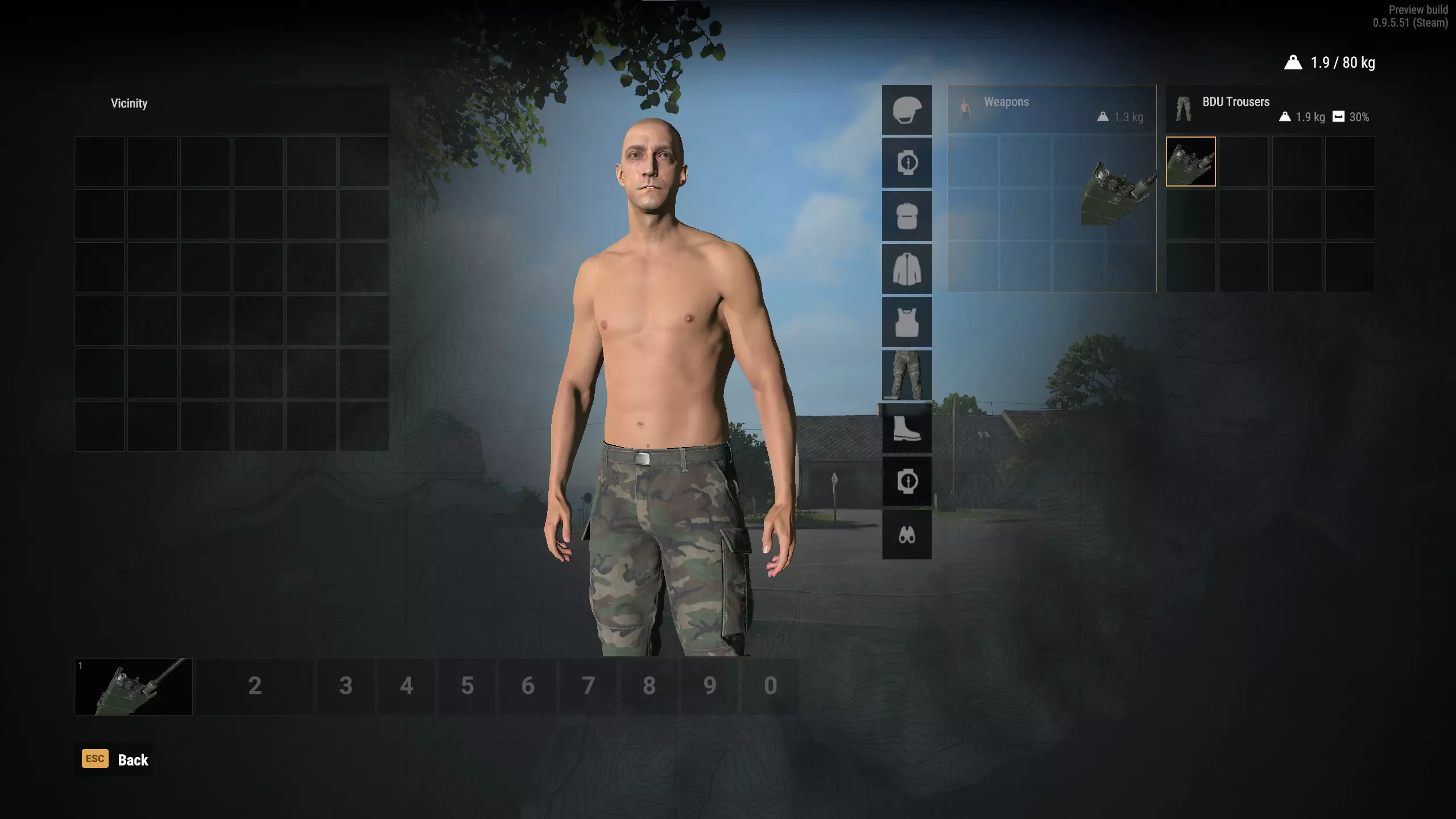 上图所示的红色圆圈是所有阵营使用的背负式野战电台的2公里范围。其内部较小的蓝色圆圈则显示了1.3公里便携式手持电台的范围。 请注意,你离目标接收者越远,发送信息时的静电和噪音就会越多。关于这一点,将在后续几个部分中详细说明。 我能携带多少台电台?什么是“双通道”/扫描? 你还必须拥有某种能够容纳电台的库存容量。赤身裸体时,你无法手持电台。在这里,我将AN/PRC-68电台放在裤子里,并尝试将其移到赤裸的身体上,但1.3公斤太重,游戏拒绝了这一操作。