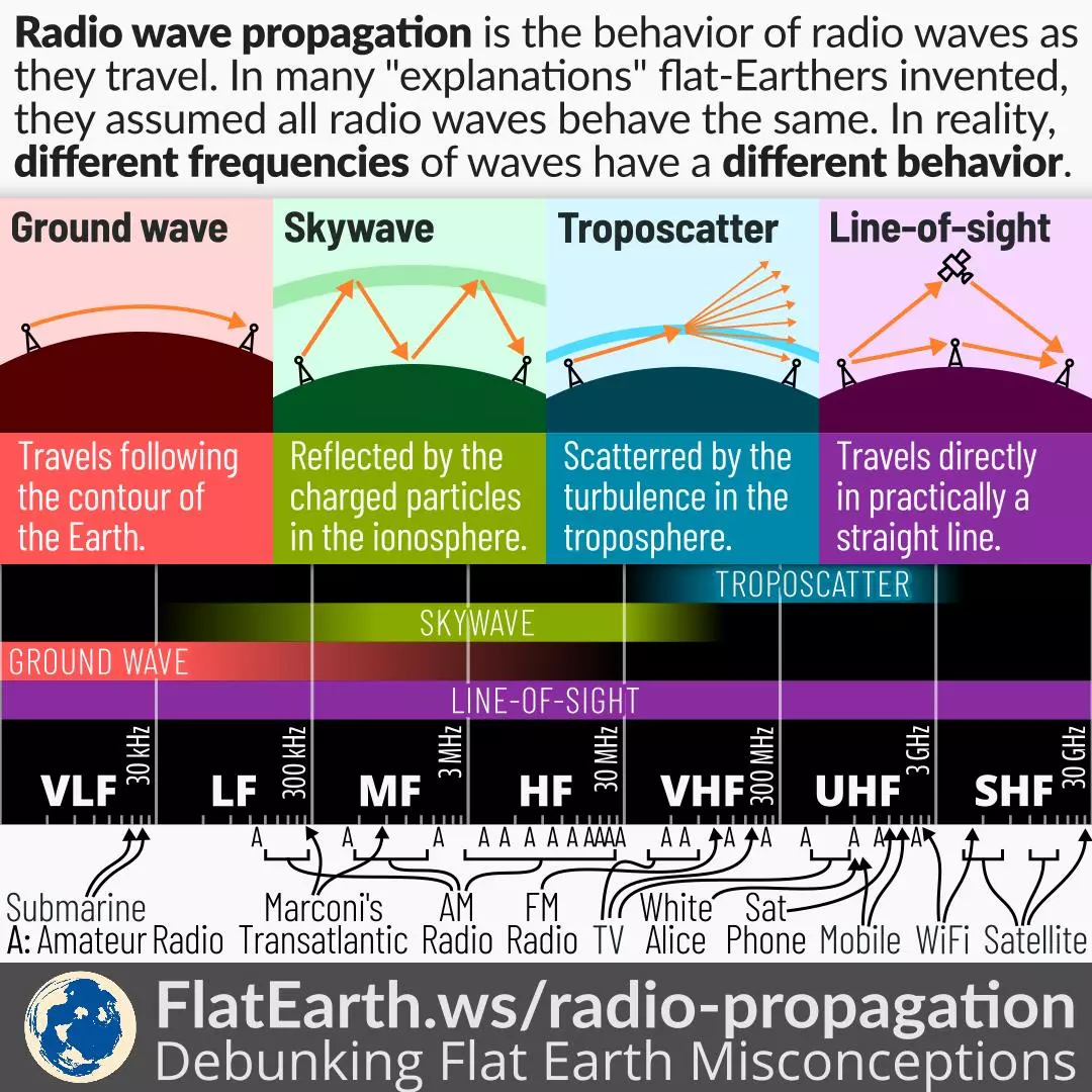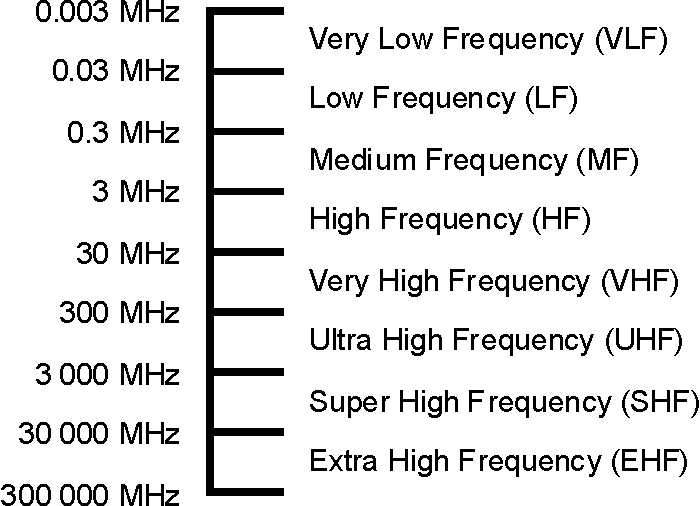 甚高频 30 MHz - 300 MHz 甚高频段的无线电波主要通过视距传播和地面反射路径传播;与高频段不同,在较低频率下,电离层的反射(天波传播)较少。它们不会像地波那样沿着地球轮廓传播,因此会被丘陵和山脉阻挡。它们可以穿透建筑物墙壁并在室内接收,不过在城市地区,来自建筑物的反射会导致多径传播,这可能会干扰电视接收。与较低频段相比,此频段及更高频段的大气无线电噪声和电气设备干扰(RFI)问题较小。
