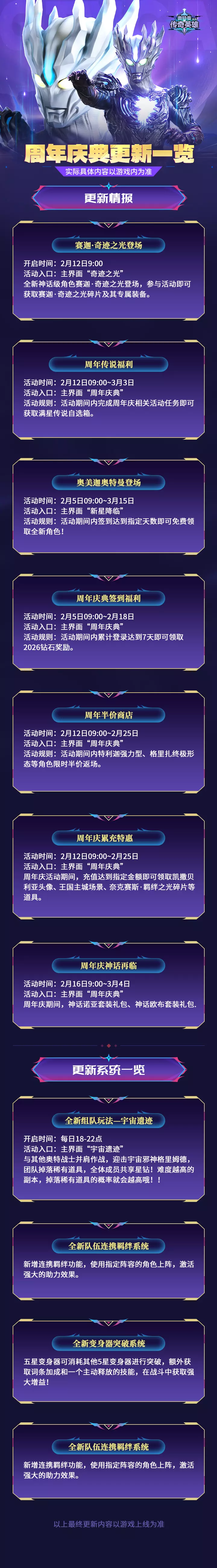 《奥特曼传奇英雄》八周年庆典活动开启,参与周年活动即可免费获取6星传说角色,在本次活动中,你可以从布鲁、罗索、暗黑欧布、泰迦、芝庞顿、贝利亚6位传说角色中挑选一位直接获取满星。