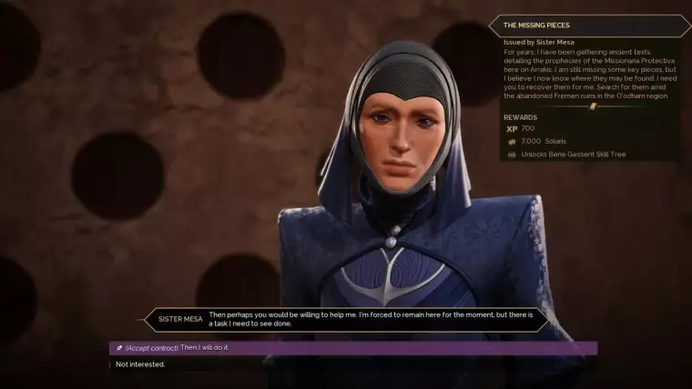 位置:赫利俄斯之门,东壁垒谷。 解锁:贝尼·杰瑟里特技能树。 奖励:7000索拉里,700经验值。 任务:贝尼·杰瑟里特基础:缺失的碎片(Bene Gesserit Basics: The Missing Pieces) 寻找名为《里桑·艾尔·盖布与…》的文本。 找到《马赫迪之刃》文本。 将《里桑·艾尔·盖布与…》文本交给梅兹修女。 将《马赫迪之刃》文本交给梅兹修女。贝尼·杰瑟里特高阶导师:雅科斯塔·克丽奥(Jacosta Cleo)