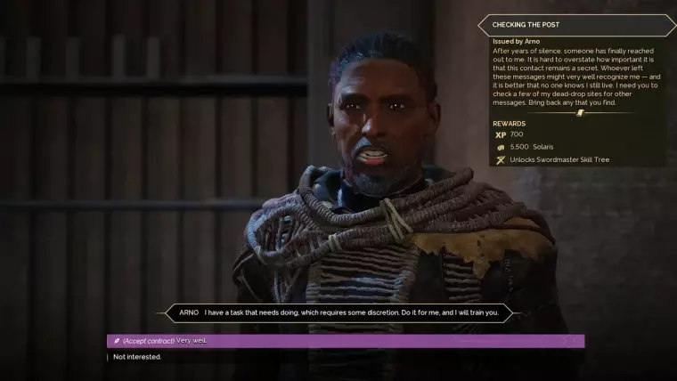 位置:“顶点”站,贾巴尔-埃夫里特·阿尔-加尔布地区。 解锁:剑师技能树。 奖励:5500 索拉里,700 经验值。 任务:剑师基础:哨所检查(Sword Master Basics: Checking the Post) 找到恶魔之眼洞穴(Devil's Eye Cavern)。 搜查“帕拉斯坠毁点”。 调查帝国第 76 号试验站。 返回“顶点”站向阿尔诺汇报。剑术大师的高级导师:塞隆·瓦林(Seron Varlin)