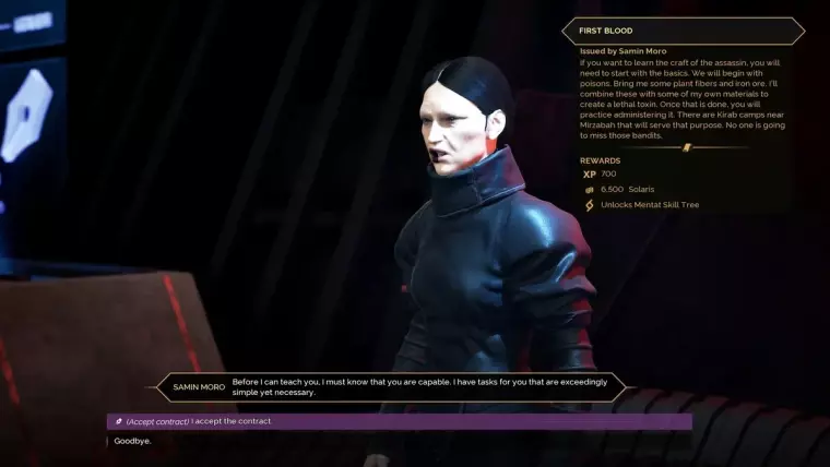 位置:哈格裂隙(Hagga Rift),裂隙哨站(Riftwatch)附近。 解锁:灵能者技能树。 奖励:6500索拉里,700经验值。 任务:灵能者基础:初露锋芒(Mentat Basics: First Blood) 交付100单位植物纤维。 交付40单位铁矿。 对补给进行下毒。 返回裂隙哨站汇报。 高级灵能者导师:泽恩·德·维特(Zayn de Witte)
