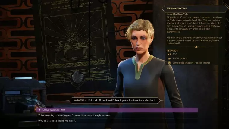 位置:哈格南部盆地,狮鹫贸易前哨站。 解锁:突击兵技能树。 奖励:2000太阳能,700经验值。 任务:突击兵基础:试炼场(Trooper Basics: Proving Grounds) 在卡莱夫据点(Kaleff's Stand)消灭阿图·戈尔文。 在沙马尔隧道(Shamal Tunnel)摧毁柯西·托尔。 在边缘洞穴(Edgeway Cavern)清除卡丹努斯·乌伦。 向狮鹫前哨站的加武里汇报任务完成情况。高级突击兵导师:卡拉·瓦尔克(Kara Valk)