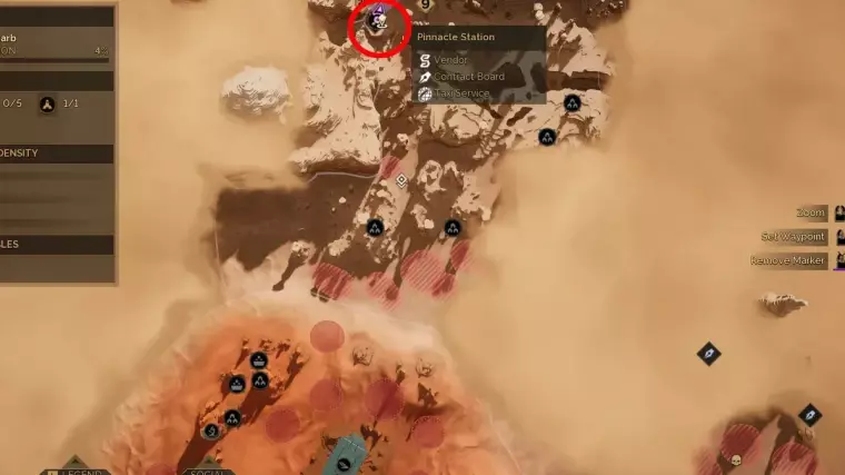 剑术基础导师阿尔诺位于“巅峰站”(Pinnacle Station)——贾巴尔-埃夫里特-阿尔-加尔布地区的一个贸易站。要到达他那里,需从西朱砂峡谷中巨大的“帕拉斯号残骸”处向正北方向行进。这个贸易站外观与其他贸易站(如“狮鹫之巢”和“锻造厂”)非常相似,因此从远处很容易辨认。