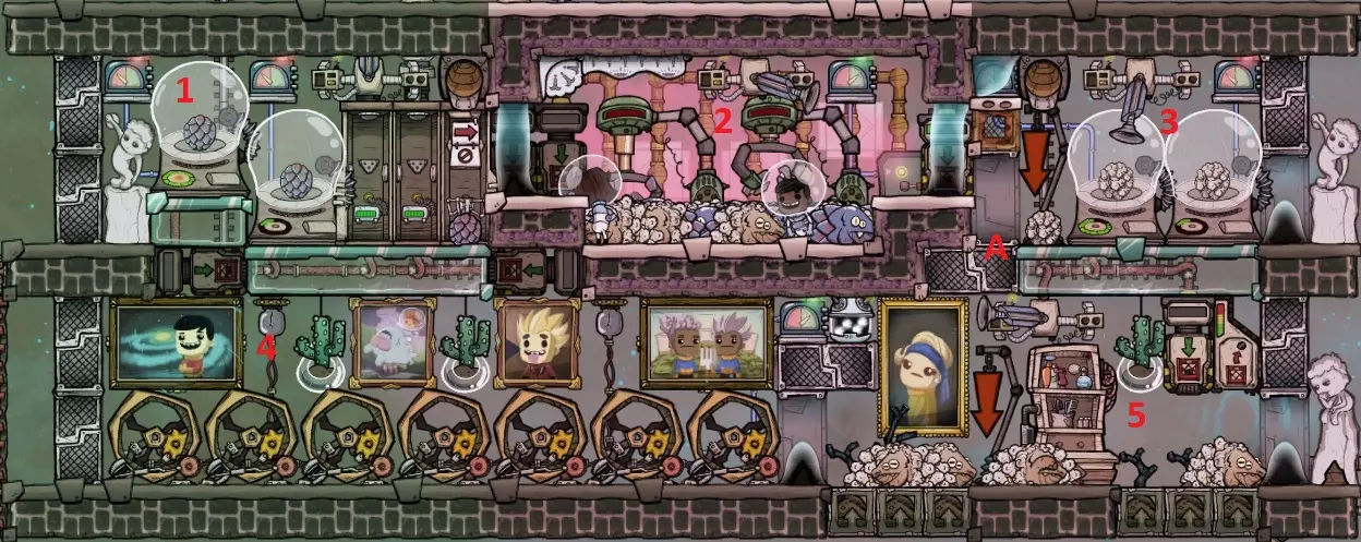 本指南适用于新手。 本指南涵盖了从游戏开局直至通关的要点,以及应当注意的问题,可以有效避免因游戏中期失误而导致后期无法继续、废弃存档的情况。 本指南尽可能避免涉及具体的布局级“模块”,作者认为自行研究布局及模块是此游戏的主要乐趣之一。 本指南以《眼冒金星》DLC内容为准。 概述 游戏阶段在本指南中,游戏分为5个阶段: 初期:从选择初始复制人开始,至临时满足复制人基本需求的阶段。此阶段一般没有任何难点; 前期:在此阶段,核心基地逐渐成型,能够在相当长的期间内满足复制人的基本需求,建立初步的工、农、牧业; 中期:在此阶段,完善工、农、牧业,开始建立供需平衡; 后期:在此阶段,完成科研为目的的太空探索,完善基地的供需平衡,开发第二小行星(有传送); 末期:开发其他小行星,完成三个游戏终极目标;其中,前、中期最容易产生隐患,导致后期不得不废弃存档。 本篇攻略主要讲解流程,细节请参见另外一篇攻略: https://steamcommunity.com/sharedfiles/filedetails/?id=2507136746 核心要素本游戏的核心要素分为两类: 维生要素 氧气:复制人需要氧气(或污染氧)维生; 食物:复制人需要食物维生; 排泄:复制人需要厕所进行排泄;如无厕所可用则复制人会在当前地块产生污水; 清洁:复制人清洁自身,减少身上的病菌; 床:复制人会在床上就寝;如无床可用,复制人会产生不良状态; 压力:压力过高会导致复制人不良异常,异常取决于复制人;士气会影响压力的产生,休息以及部分建筑会降低压力; 士气:复制人的技能点决定士气需求,装饰度、食物、休息等多项因素影响士气供给;士气低于0会产生压力;士气高于一定数值复制人会喜悦,喜悦表现取决于复制人; 装饰度:环境的装饰度会影响士气;部分物件会增加装饰度,部分物件会减少装饰度; 医疗:复制人会因伤病产生不良状态,需要医疗设施治疗伤病;生产要素 水:多项维生、生产要素需要水; 电:几乎所有的维生、生产要素都需要电; 烹饪:烹饪可以提高食物品质,影响士气; 农业:生产食物、药物的原材料;以及少许其他用途; 牧业:生产食物原材料;生产工业原材料;以及少许其他用途; 渔业:生产食物原材料; 工业:生产各种材料; 科研:大多数其他要素的基础; 热量:保持合适的温度,确保复制人舒适,以及其他要素的稳定产出; 通用游戏中有些事物是随机的,下列几项极为实用,如果有发现应当优先利用,而不是按照本攻略的顺序: 乔木树/乔木橡实:中期之前,如果补给刷出乔木橡实,一定要优先获取,并进行栽种,建立木料——乙醇——石油发电机产业链;在有乔木树的前提下,优先获取“树鼠蛋/小树鼠”。 低温泥浆间歇泉、低温盐泥间歇泉:一旦发现要优先进行开发;建立水池后,使用水泵令液体在核心基地和高温设备(例如炼油、金属提纯)处进行散热,使用沉积岩建造普通水管即可;中期的制冷设备可以延后建造。 污染水间歇泉、水间歇泉:查看温度,如果是35℃或以下,应当提前开发;如果是35℃以上,千万不要提前开发;盐水间歇泉不必提前开发。 初期 目标 为每名复制人建造床铺 建造临时卫生设备(户外厕所/洗手盆) 建造临时供水系统(手压泵) 收集临时粮食(淤泥根) 建造临时供电(人力发电机) 建造初期供氧(氧气扩散器、藻类箱) 初级科研 复制人选择本指南主要针对最简单的第一个星球类型,其他类型的开局方式有所不同。 初始的三个复制人可以反复刷新以获得期望的特性,需要善加利用。 建议避免下列不良特性: 需要光才能睡觉 移动速度降低 睡觉鼾声很大 初期不要有“降低挖掘”或“无法挖掘” 建议复制人有下列“个人兴趣”: 挖掘+科研:开发第二星球时,往往需要挖掘技能才能到达资源传送设备,同时需要科研才能启动资源传送设备; 建造+机械(+科研):建造技能可以加快建造速度,而建造某些建筑和自动化设备需要机械技能; 农业+畜牧(+科研):前期即需要畜牧技能,农业不是必要;如果懒得反复刷新,至少要确保有一个“挖掘”技能和一个“科研”技能,最好也有一个“畜牧”技能。 挖掘技能决定能否挖掘“较坚硬”的石头,如果缺少此技能,前期基地扩张会受阻; 科研技能决定是否能够研究三级及以上科研,如果缺少此技能,前期科研会受阻; 本指南的玩法,需要尽快开始养殖“毛磷壁虎”,因此需要畜牧技能。 在游戏中,每过一段时间,可以获得支援的复制人,支援的复制人是随机的,三选一,无法反复刷新,运气不好时会无法获得必要的技能,所以建议在开始时备齐重要技能。 挖掘+科研的组合,在开发第二星球时,要隔一段时间才能传送一次复制人,因此这个组合可以尽快开展工作。 第一周期游戏开始后建议先暂停,看一下周边环境,并设计一下基地的布局。第一局可以先随便玩玩,并思考一下之后要怎样设计。 以我个人的习惯,包括打印舱在内,建造一个24格宽、4格高的房间(不含墙),作为临时厕所及临时科研房间,打印舱在房间一端;在打印舱这一端,同行建造一个16格宽、4格高的房间(不含墙),作为卧室;两个房间的墙壁之间,空7格,将来作为楼梯间以及放置必要设备。 挖掘出房间的一部分之后,在卧室建造3张床铺,在打印舱旁边(远离卧室的方向),依序建造洗手盆2个,户外厕所2个。 在完成上述必须建筑之后如果仍有时间,向各方向开始挖掘,在楼梯间向下建造梯子,在净水处建造手压泵。 设置初期的”口粮箱“接受所