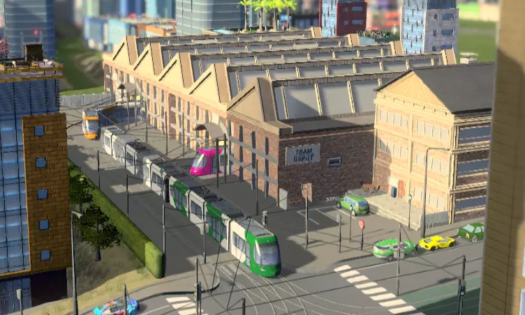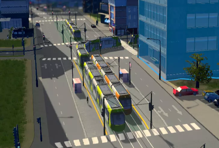电车行驶在嵌入路面的轨道上。与公交车类似,它们提供一种“最后一公里”的接驳服务,将市民从家中、工作场所或其他任何地方送往最近的火车站、地铁站或渡轮码头。不过,电车的载客量比公交车有显著优势,非常适合在城市人口最密集的区域承担往返火车站和地铁站的客运任务。 电车轨道既可以建造为独立轨道,也可以是街道轨道,从而能够在地面构建轻轨系统(但需要“Tram Station Track”模组才能放置电车站资产)。 建造电车轨道时要注意,即使在路线上使用双端电车,电车也无法反向行驶。因此,请确保在路线末端设置环形轨道,以便它们掉头。电车车库