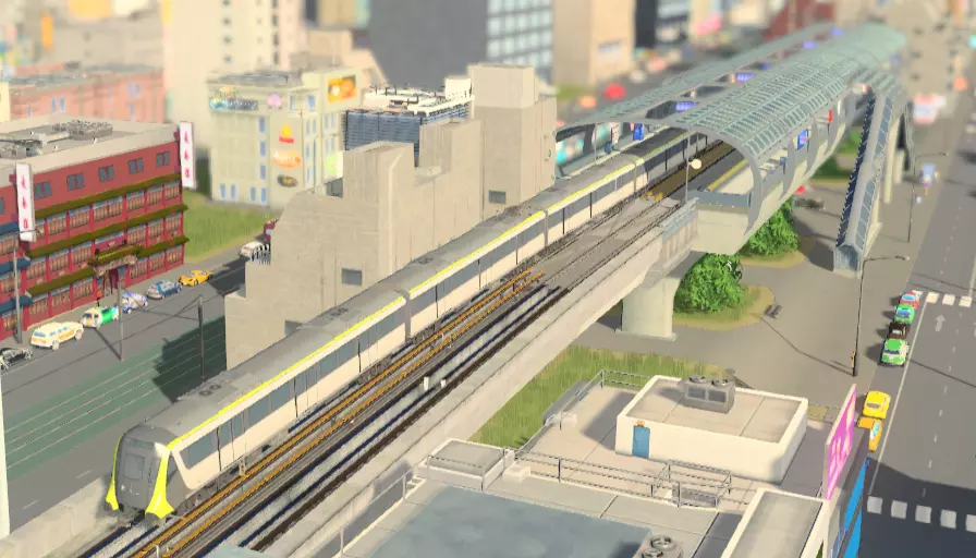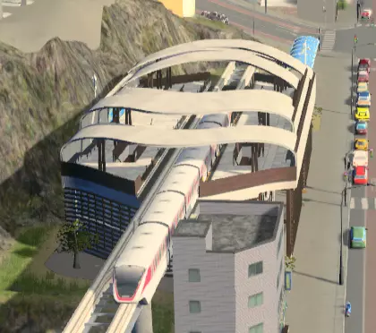 这些资产在多条公交线路于同一地点(如火车站或机场)终点时非常有用。它们充当这些线路的枢纽,允许市民在不同线路或其他交通方式之间换乘,同时最大限度减少地面空间占用。 公交总站可通过《After Dark》DLC获取,创意工坊中也有许多小型公交枢纽。此外,《Plazas and Promenades》DLC中还提供了紧凑型公交总站。 轻轨/单轨 第三,我们来看看中等运力的陆路交通。 单轨