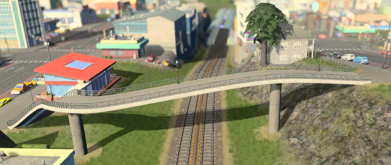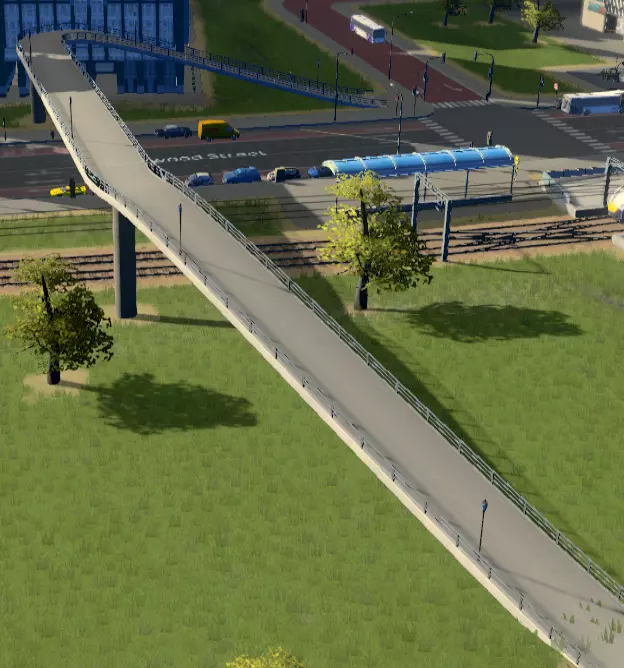 人行道和过街设施在这方面也能发挥作用,它们可以提供更便捷的公共交通站点路线(例如穿过铁路线、抄近路穿过社区到达公交站),或者只是让市民能够到达马路对面。它们可以像道路一样建造为桥梁和隧道,但不能与道路平面交叉(你可以使用“Crossings”模组来建造人行横道)。 站点间距