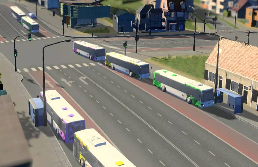 如果你使用“地铁大修模组”(Metro Overhaul Mod),地铁列车将从车辆段而非车站生成。请确保将车辆段连接到你希望生成列车线路上离其位置最近的车站,否则列车将无法生成。 列车拥堵:与道路类似,当列车在车站停靠时,铁轨也会出现拥堵,这会导致车辆消失,从而阻碍乘客和货物到达目的地。为尽量减少拥堵,每条轨道对最好不要超过两条线路。 此外,最好将市内交通网络与城际交通网络及货运网络完全分开,因为根据需求,每个网络上的列车数量都会相当多。在两条不同铁路线的交汇处,最好对该交汇处进行立体交叉设计,这样可以避免不同线路上的列车相互交叉(无需等待对方驶离交汇处)。为此,你需要使用单行道轨道,以确保列车按你期望的路径行驶。 地铁和单轨轨道同样适用此规则,但它们本质上不会与城际铁路和货运网络相交。 道路运输 接下来,我们将了解低容量陆路运输 公交车