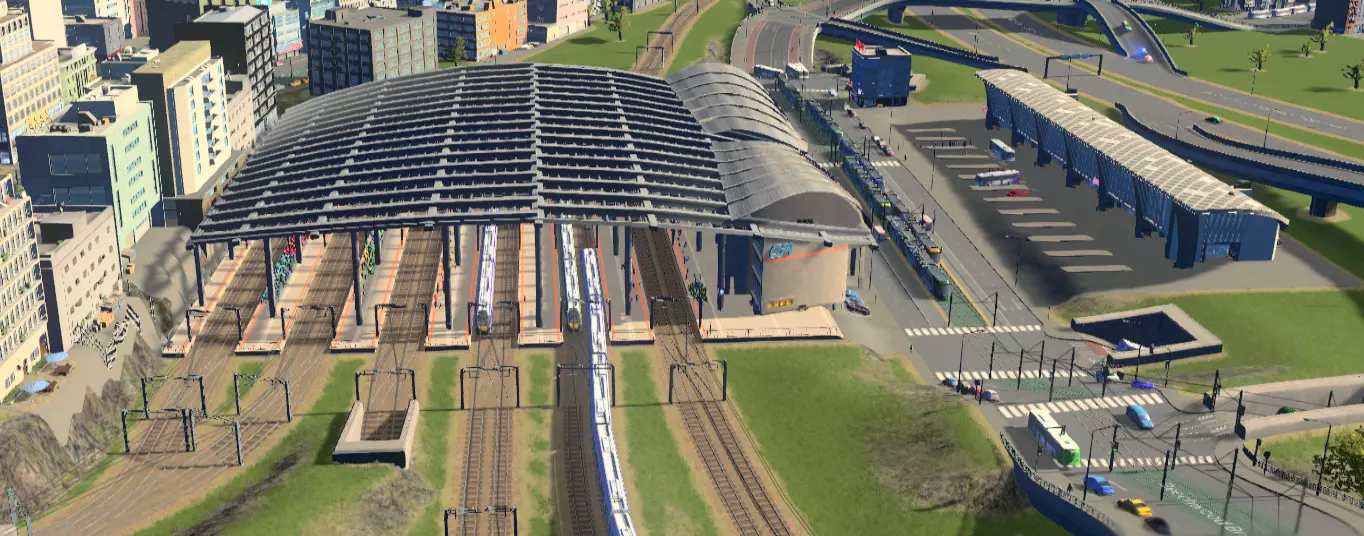 如果你曾遇到严重的交通拥堵、建筑物抱怨“买家不足”等问题,缺乏完善的公共交通可能是原因所在。本指南将帮助你打造城市所需的公共交通系统。 简介 构建高效的公共交通系统对任何城市的正常运转都至关重要。它为市民提供了除驾车之外的可行选择,从而显著缓解交通拥堵。这反过来能让道路为真正需要的车辆腾出空间,例如应急车辆、城市服务车辆和卡车。 理想情况下,该系统应尽可能覆盖城市的大部分区域,但你也可以选择专注于需求最高的区域。为此,我们需要确保系统快速、高效且便捷。准备就绪后,请向下滚动至下一部分。 推荐项目 以下是我推荐使用的内容列表,但并非必需。 DLC https://store.steampowered.com/app/369150/Cities_Skylines__After_Dark/?curator_clanid=6625556 https://store.steampowered.com/app/420610/Cities_Skylines__Snowfall/?curator_clanid=6625556 https://store.steampowered.com/app/547502/Cities_Skylines__Mass_Transit/?curator_clanid=6625556 https://store.steampowered.com/app/1146930/Cities_Skylines__Sunset_Harbor/?curator_clanid=6625556 模组 关于公交站台(仅限创意工坊资源)或车站月台的选择: https://steamcommunity.com/sharedfiles/filedetails/?id=2862973068 关于高架和地下客运火车站: https://steamcommunity.com/sharedfiles/filedetails/?id=515489008 关于额外线路选项: https://steamcommunity.com/sharedfiles/filedetails/?id=1312767991或 https://steamcommunity.com/sharedfiles/filedetails/?id=928128676 关于额外地铁选项: https://steamcommunity.com/sharedfiles/filedetails/?id=816260433 关于有轨电车站资产的放置: https://steamcommunity.com/sharedfiles/filedetails/?id=707497031 关于游戏内船舶航线的创建(连接岛屿时很有用): https://steamcommunity.com/sharedfiles/filedetails/?id=512314255 关于车道和路口管理(例如禁止私家车进入公交专用道、更改公交专用道箭头、创建跨站台铁路换乘站): https://steamcommunity.com/sharedfiles/filedetails/?id=1637663252 如需更多道路选项: https://steamcommunity.com/sharedfiles/filedetails/?id=812125426 如需在非交叉路口位置设置人行横道: https://steamcommunity.com/sharedfiles/filedetails/?id=427258853 任何允许创建单轨铁路的模组(有助于实现铁路平交路口的立体交叉和跨站台铁路换乘) 资产 任何多站台火车/地铁站(即超过2个站台)。有助于在保持线路分离的同时,实现线路间的换乘。 任何高架/地下火车站 任何小型公交枢纽 网络设置 在创建网络时,有多种方法可供选择——具体选择哪种方法取决于你自己。请记住,你所做的每一个选择都会决定网络的效率,因此请根据你希望网络的使用方式做出明智选择。 多模式连接 如果你只是建造一个小镇,没有其他规划,那么本节内容与你无关,因为此时大多数人很可能都可以通过公交车出行。但如果你拥有一座大城市,或者计划建造一座大城市,那么使用多种公共交通模式对于网络实现最高效率运行至关重要。