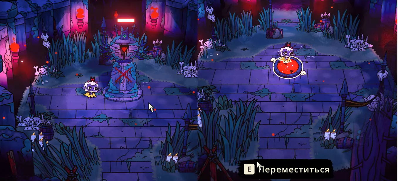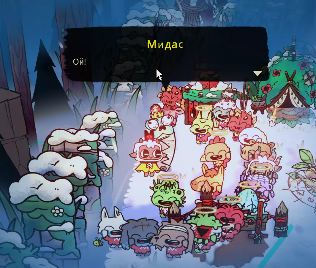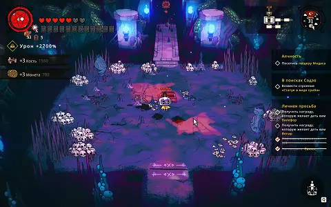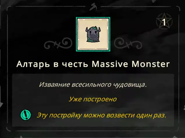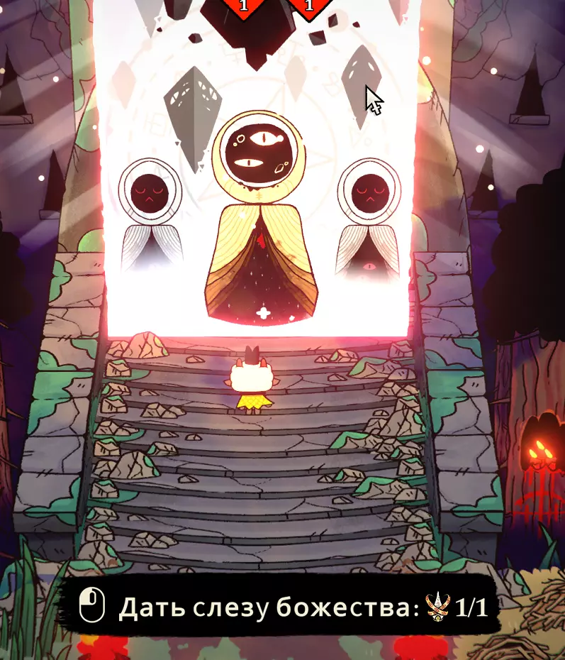 看看这个怪物,它一击就能干掉任何敌人。四月更新后新增了圣物和新符文。我觉得狂战士符文很有趣,能让我们变成“玻璃大炮”(高输出但低生存能力的角色)。圣物方面,能暂停时间的那个很有意思。总之,现在的战术更多了,获取成就也因此变得更容易了。引用自 minmatvik:关于2023年5月时“不受Boss伤害”这一成就,补充说明一下:游戏中有恶魔祭坛可将居民转化为助手,制作2-3个助手后,每个剑士/弓箭手/炸弹手的攻击力会+5,对Boss的伤害非常高。另外,如果运气好的话,会获得伤害防护魔法以及时间停止圣物,但需要注意的是,必须完整走完整个流程——我就是这么做的,在流程末尾会出现回家的出口,而我们前往 Boss 处,暂停时间/进行防御,而队友能在几秒内击败任何敌人。引用自 FINGeR:装备“狂战士”符文,召唤佩安恶魔(每个信徒等级消耗一半生命值),进入地下城。在那里寻找手套/短刀——攻击速度与伤害的最佳比例;通过强化寻找 2 秒无敌效果。在集齐这套装备前,在地下城里绕圈行走,不进入最终 Boss 区域(造成伤害失误时,增加生命值的恶魔会宽恕我们)。我们找到(目标)后,进入有 boss 的传送门,在技能冷却期间持续对 boss 使用无敌技能,在短短几秒钟内就将其击败。我们的第一个对手是森林守护者(Леший)。