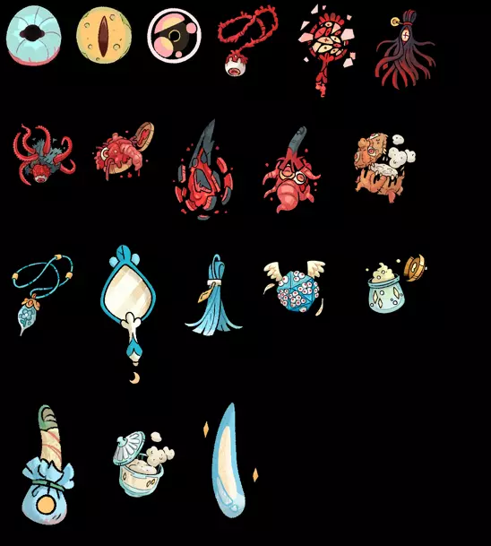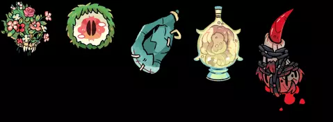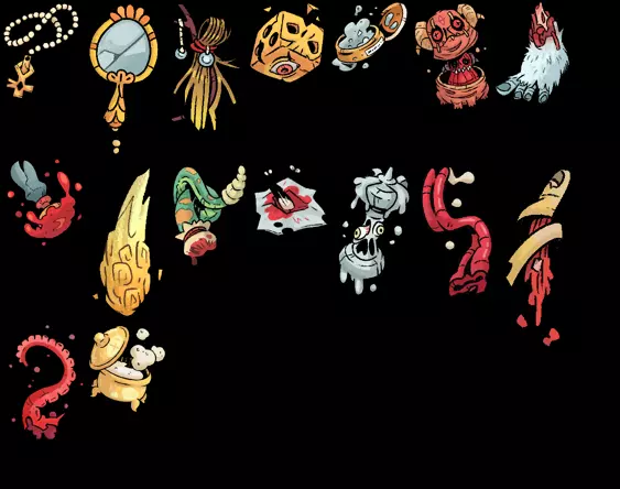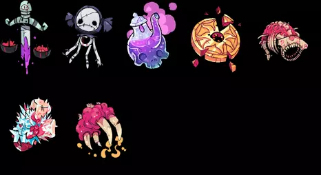7) 完成招募 Boss 的任务(4 个圣物若完成任务两次会改变外观,此处为它们最终形态的图片)。最后一个圣物通过完成每个 Boss 的任务两次获得