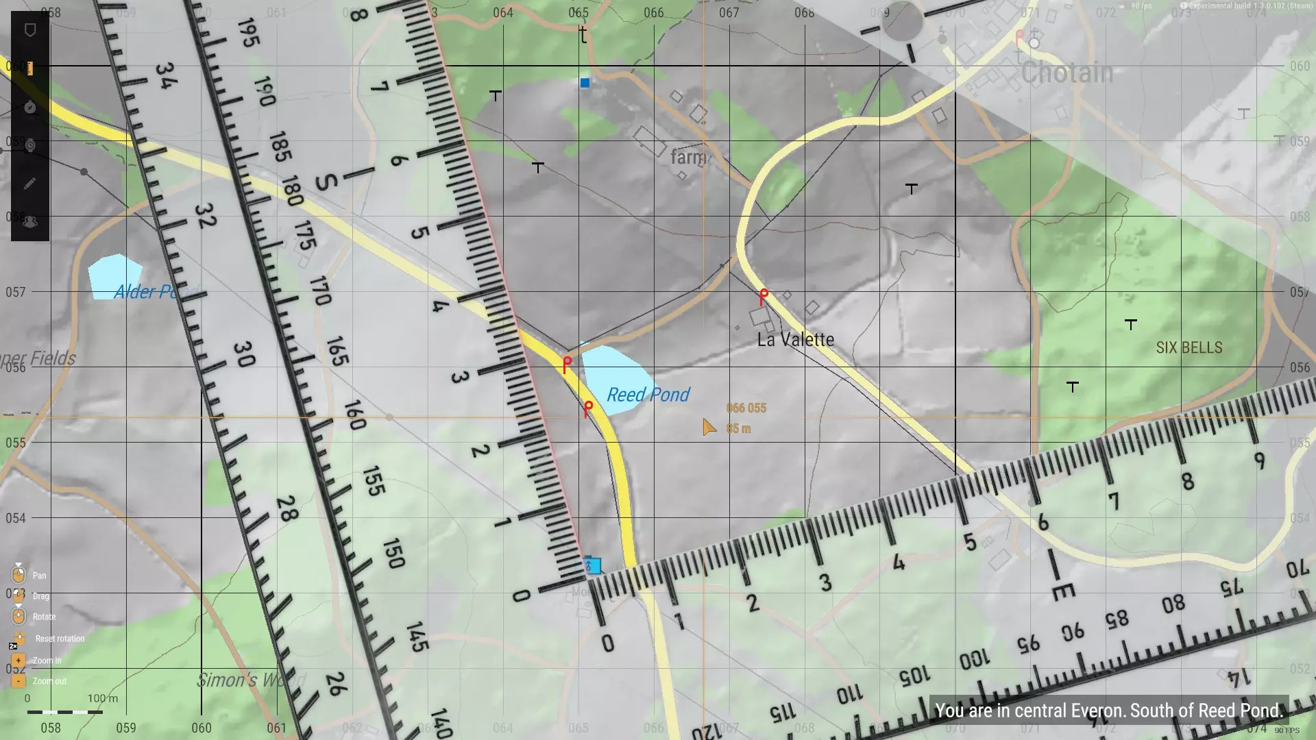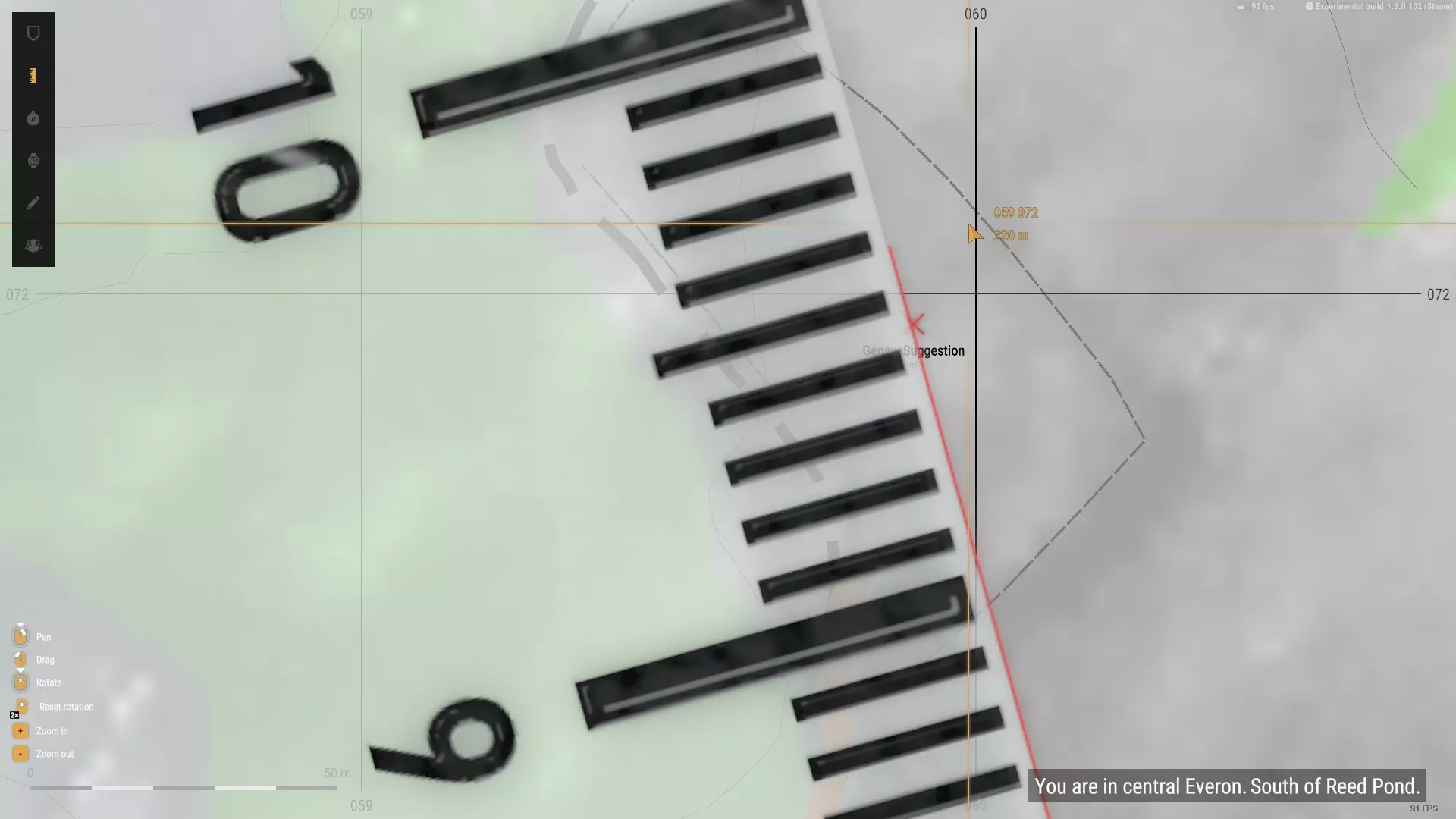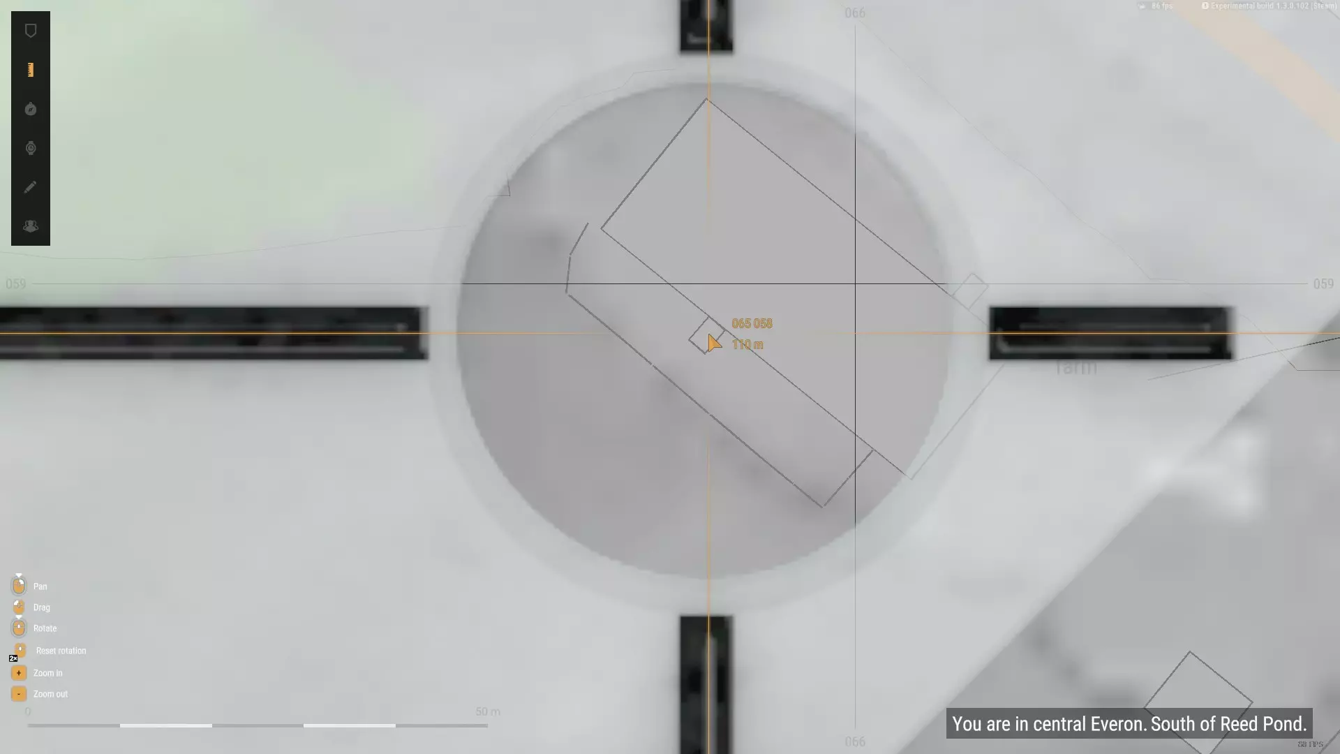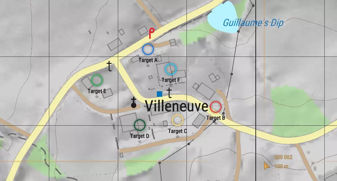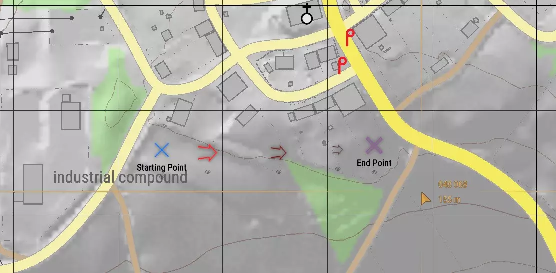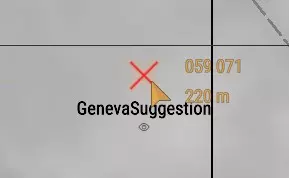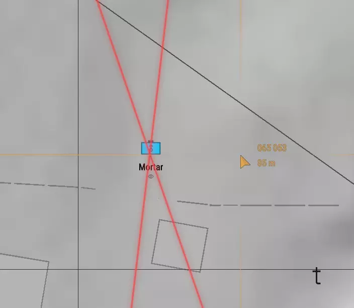 对下一个POR重复此流程。我会选择我身后的其中一栋房屋。正如你在下图中所见,线条已相交,我已尽我所能确定了自己的位置。迫击炮在地图上的位置必须准确,否则后续的计算将会出错。 编者注:在流程的这一步,我手动调整了地图上的标记,因为它看起来与我在游戏中的实际位置不符,但这也导致我的射击出现了轻微偏差,你将在后续结果中看到这一点。