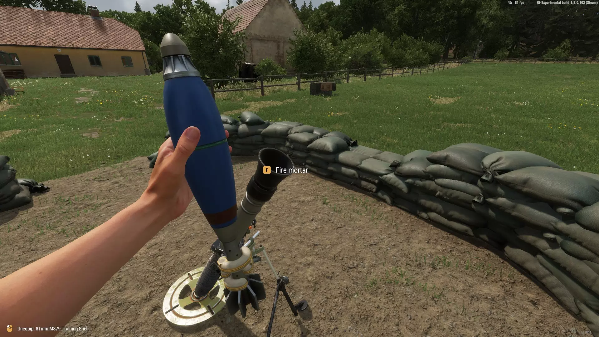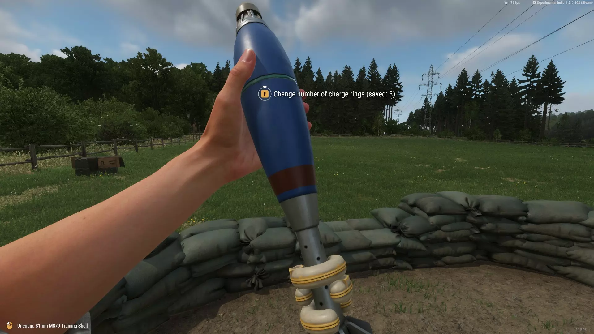 现在我们的迫击炮坐标已经设定好了,可以开火了。如果你独自操作,要记住每次射击后炮管都会偏离瞄准。虽然偏差通常不大,但可能会导致射击不准,若友军在目标附近,甚至可能造成误伤。 如果有队友和你一起,你或他应负责将炮管重新校准到指定坐标。 装填 如“工具”部分所述,装填手应携带背包(ALICE中型背包或IIFS大型战斗野战背包),内装三个迫击炮弹药筒。 在将炮弹装入炮管前,必要时需调整炮弹的环数。你可以通过检查手中的炮弹来操作。在这种情况下,我有三环线。所有炮弹默认是四环线。当你更改炮弹的环数时,系统会自动保存设置,以便你获取更多炮弹时使用。在PC端,你可以按住“F”键并使用滚轮来调整环数。