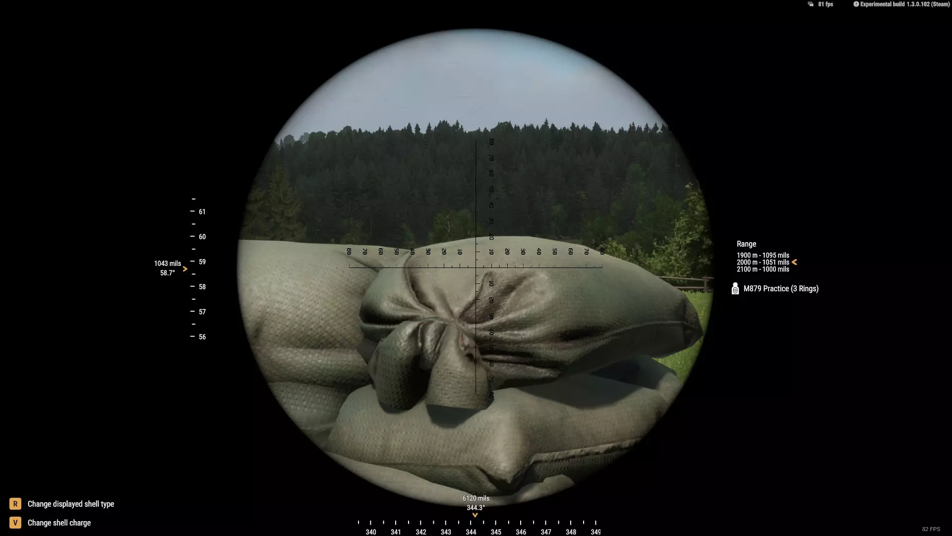 如果我们查看海拔落差列,它会显示在1900米距离上,每100米的毫弧度调整量为22密位。由于我们比目标低了近150米,我会向下调整约28密位。因为目标比我们高,这相当于距离增加,所以我们需要再次减少密位。现在我们的密位是1043。 海拔公式 你也可以使用以下公式: h x d = e 然后 c +/- e = r 或者 h(高度差)x d(每100米距离的毫弧度调整量)= e(距离上的海拔密位调整量) 然后 c(海拔调整前的目标距离密位)+/- e(距离上的海拔密位调整量)= r(总密位) 换句话说,由于我们的高度差是135米,我们用135乘以0.22,得到29。7,然后1075 - 29.7 = 1045.3 如前所述,我们再次减小密位,因为我们的目标比我们高,这意味着射程增加。另外请记住,为了准确性和一致性,我使用了新的1075密位射程,而非1073密位。 开火 这才是真正有趣的部分,我相信这是所有人都期待的环节(除了你的敌人)。我们终于可以从上方给敌人送去炮火。开始射击前,确保迫击炮本身已设置好坐标。 迫击炮用户界面底部显示的是你的方位角(方向);左侧显示距离;右侧显示内置迫击炮瞄准线的设置。这样的改动很好,因为当你需要调整与上一个坐标点的距离时,它能帮助你快速进行调整。