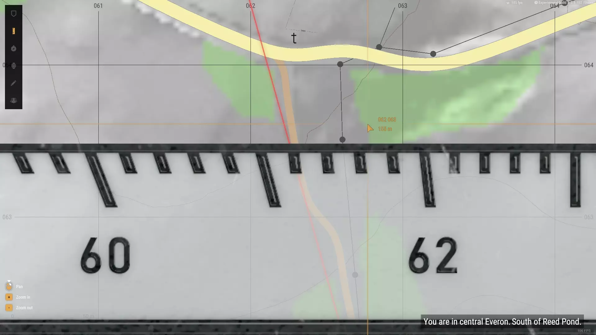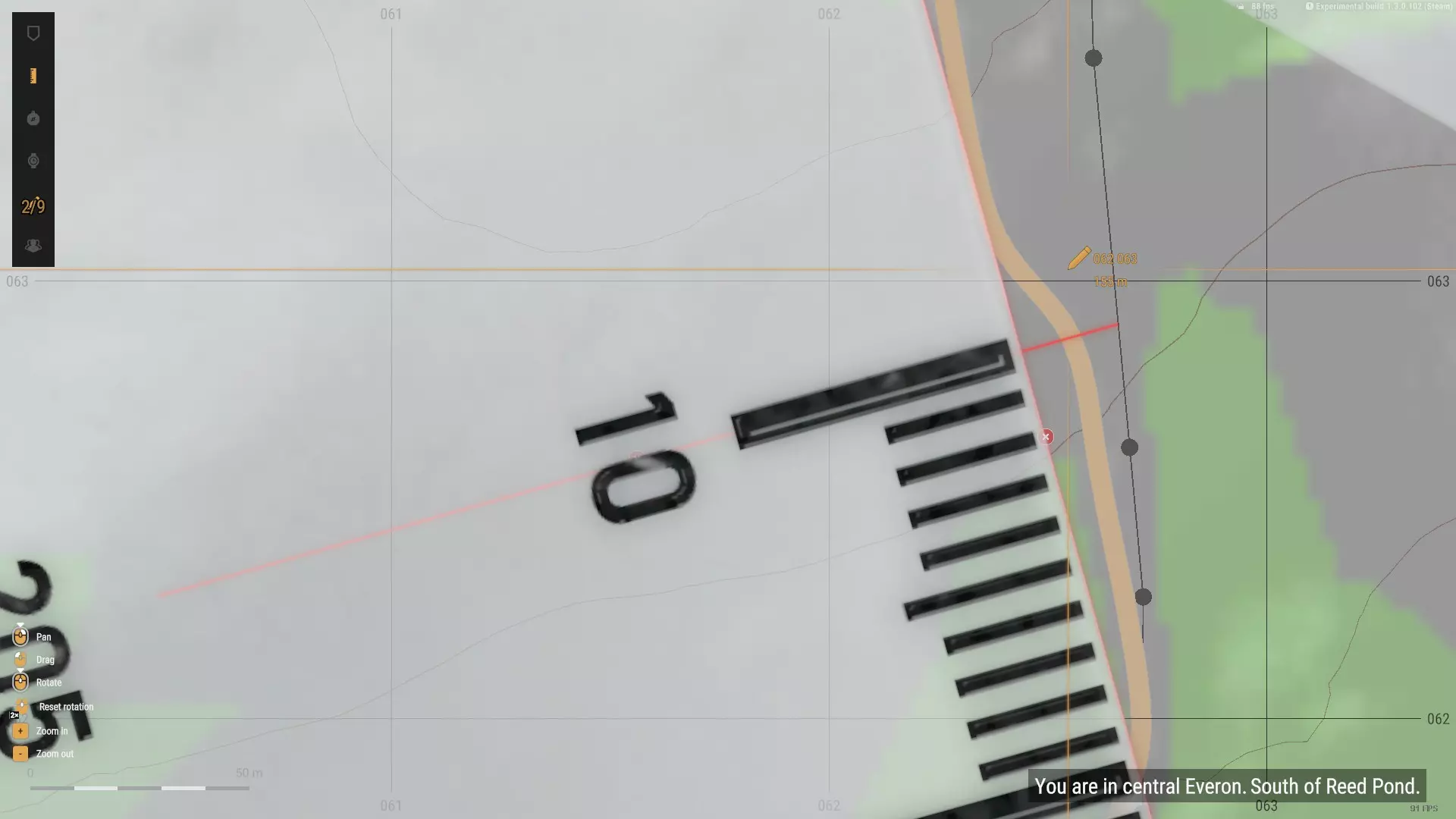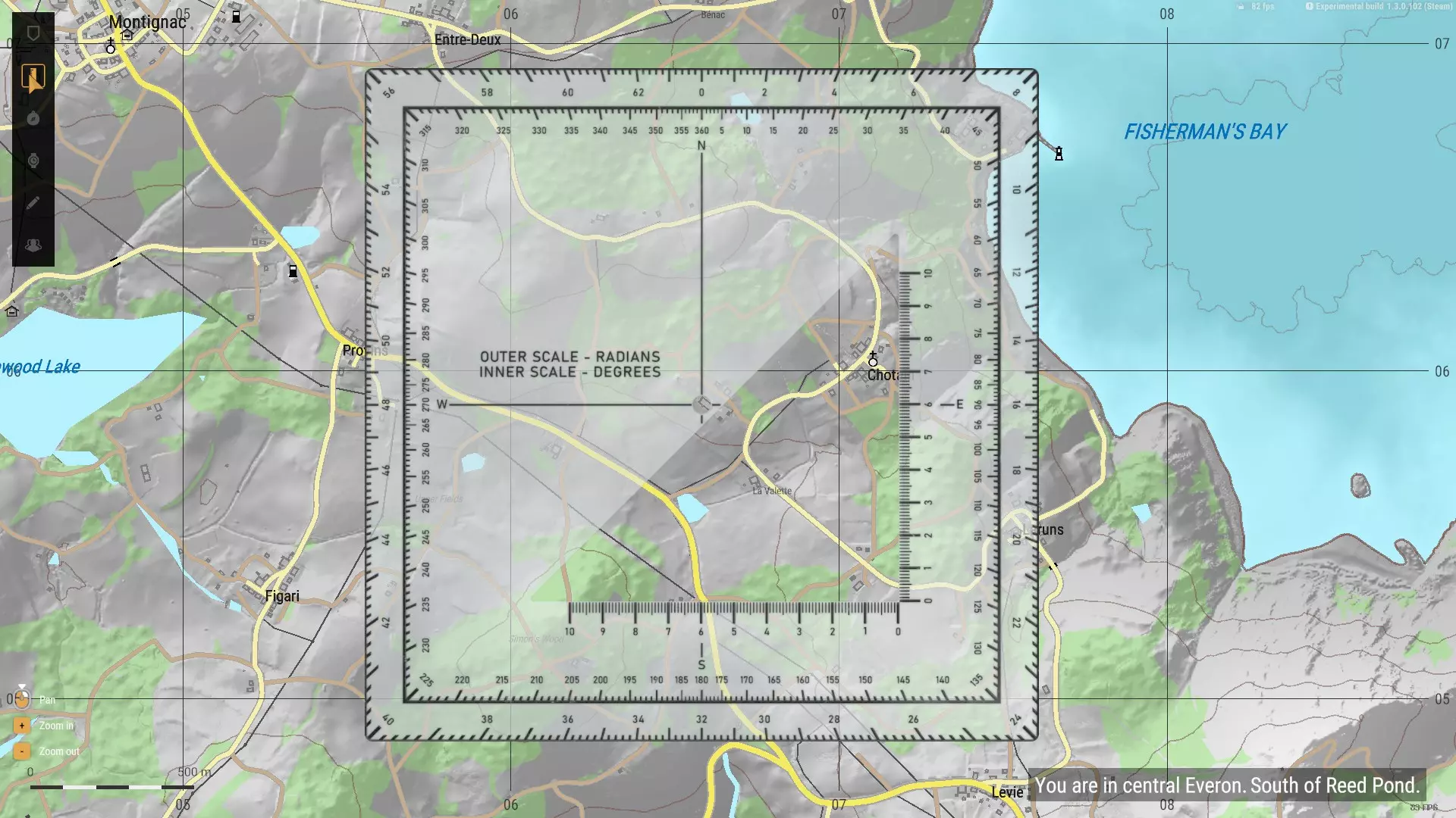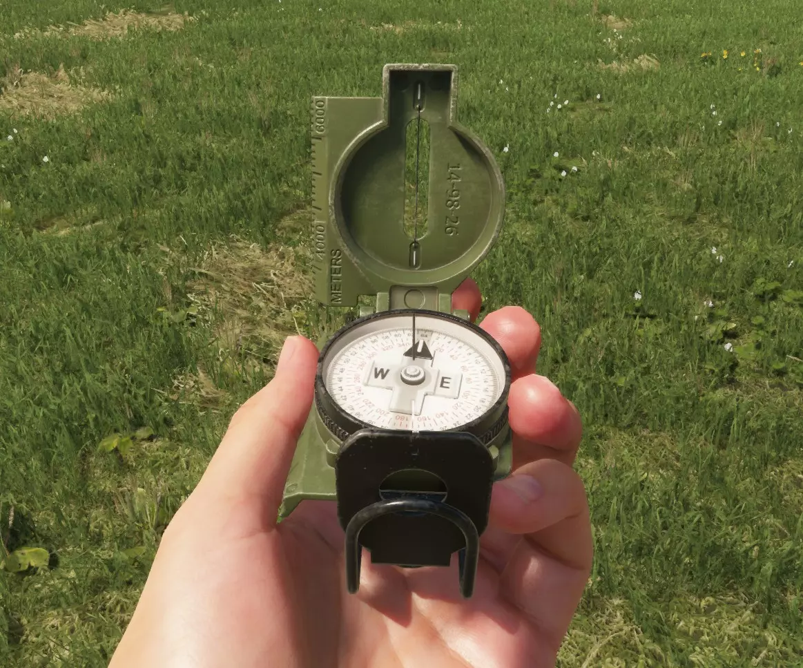 工具 在我们开始这段充满爆炸的旅程的第一步之前,我们必须首先确保拥有完成任务所需的所有必要工具。以下是一些必备物品: 地图 指南针 美军弹道手册 ALICE中型背包 迫击炮弹储存容器 衣物(可选) 地图 地图是游戏中最实用的导航工具。它具有许多独特功能,今天我将教你如何充分发挥其潜力。在迫击炮相关操作中,地图用于确定我们迫击炮阵地的位置,并找出目标相对于迫击炮阵地的距离和方位角。 地图还提供了各种有用的附加功能。对于迫击炮,我们只需要三个工具: 量角器(左上角) 铅笔(中央) 光标(同样在中央) 量角器可用于在地图上测量密位和角度,还提供一公里长的标尺来测量距离。 铅笔能帮助我们在地图上画线,需与量角器配合使用。 光标会显示其坐标网格(在当前情况下不太相关)和海拔高度。