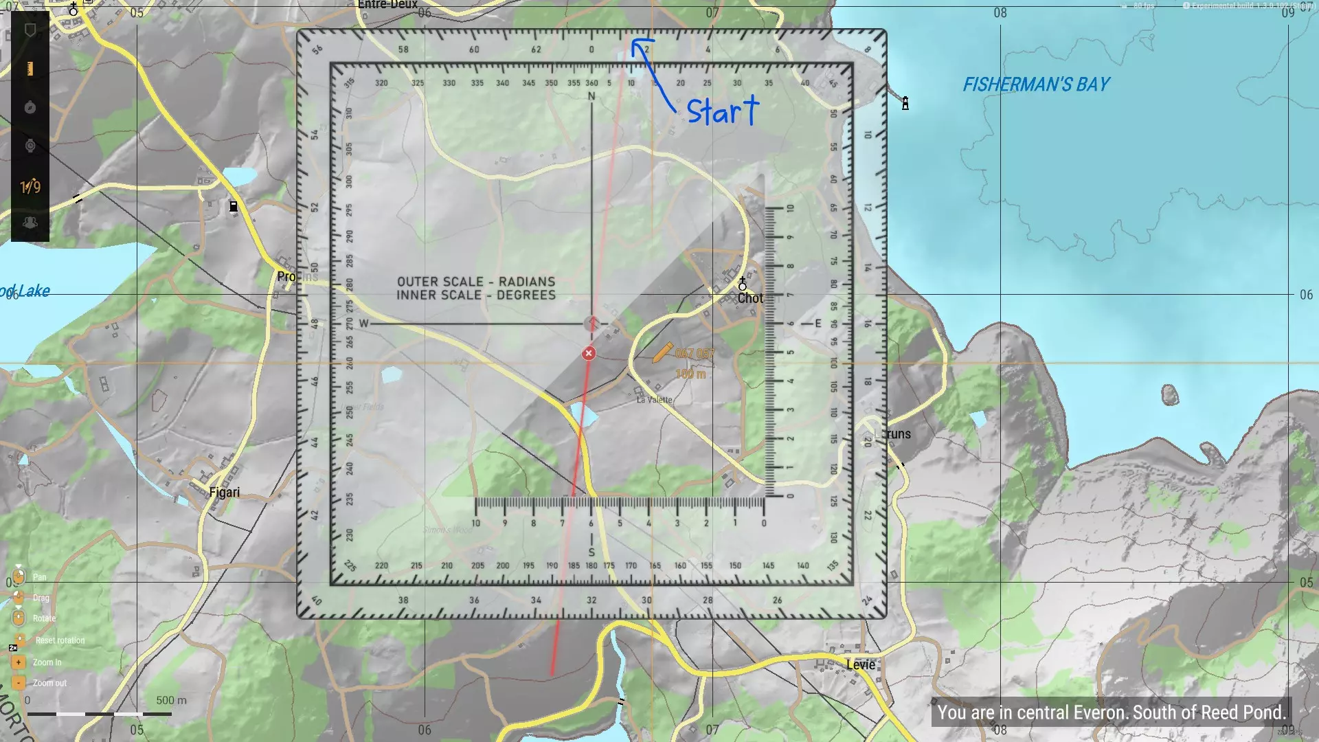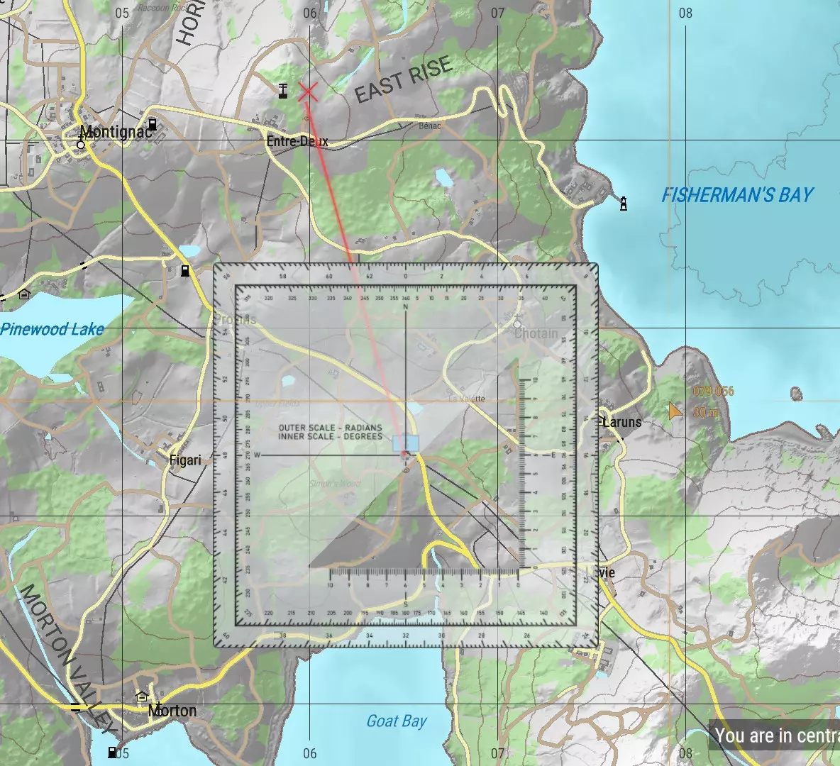 寻找目标方位角 迫击炮的一大优势在于其属于间接火力,这意味着它们不必具备极高的精度。不过,在条件允许的情况下,我们仍应努力达到相对准确的射击效果。既然我们已经有了一个已知精确的标记点(通过GM模式下的 aerial view,我有一名出色的观察员),接下来就需要从迫击炮阵地的位置确定目标坐标。 与处理PORs(目标观察点)的方法类似,我们要将量角器的中心对准我们所在的位置。