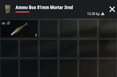 迫击炮炮弹存储容器 迫击炮炮弹容器旨在增加背包内的炮弹容量。它们还能让玩家在车辆中携带实弹而非补给品时更便于使用。每个容器最多可携带3发炮弹。根据你携带的炮弹类型,你的背包中可能只能携带8发炮弹(而非总共9发,另加手中1发)。