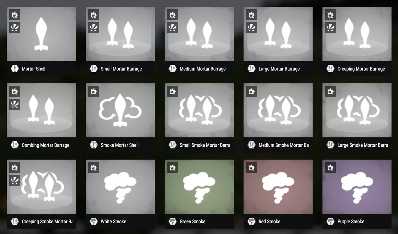烟雾弹在命中时会释放一团烟雾。它们最适合用于掩护友方步兵推进,或干扰敌方装甲单位的视野,因为高爆弹(HE)对装甲车辆的效果并不理想。射程范围约为100至2400米,环数范围为1-4。在冲突模式中,使用烟雾弹需要下士军衔,且每个消耗10补给。