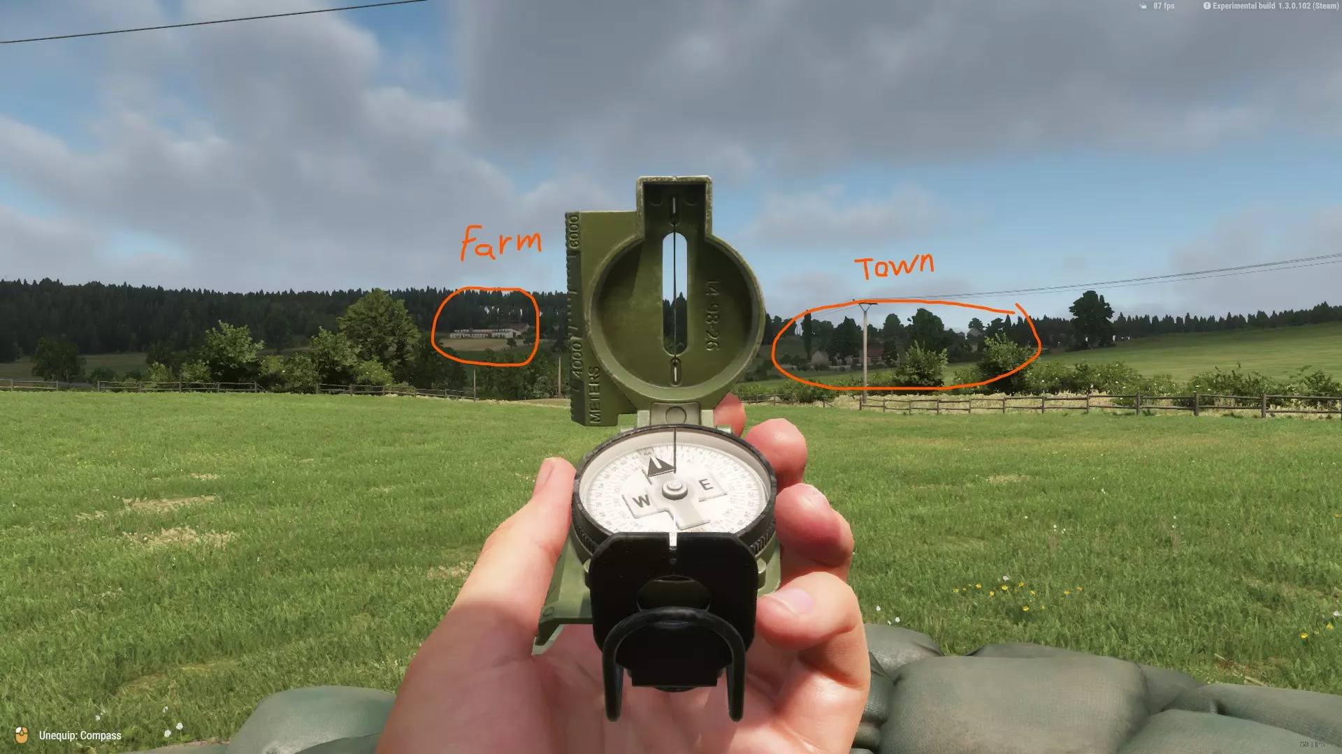 我们必须找到两个参考点(POR),甚至三个以确保更精确,以此确定我们的位置。首先,从固定位置找到两个你能清晰看到的可识别地标或明显特征。 就我而言,我看到北边有一个农场,东北方向有一个城镇。我可以估计,从农场的位置来看,城镇大致在其东南方向。这将帮助我确定地图上我看到的是哪个农场。